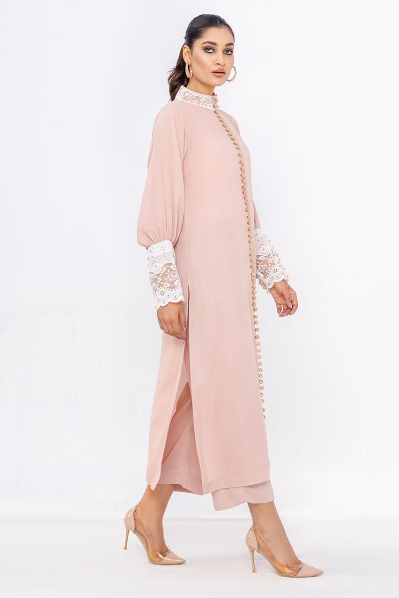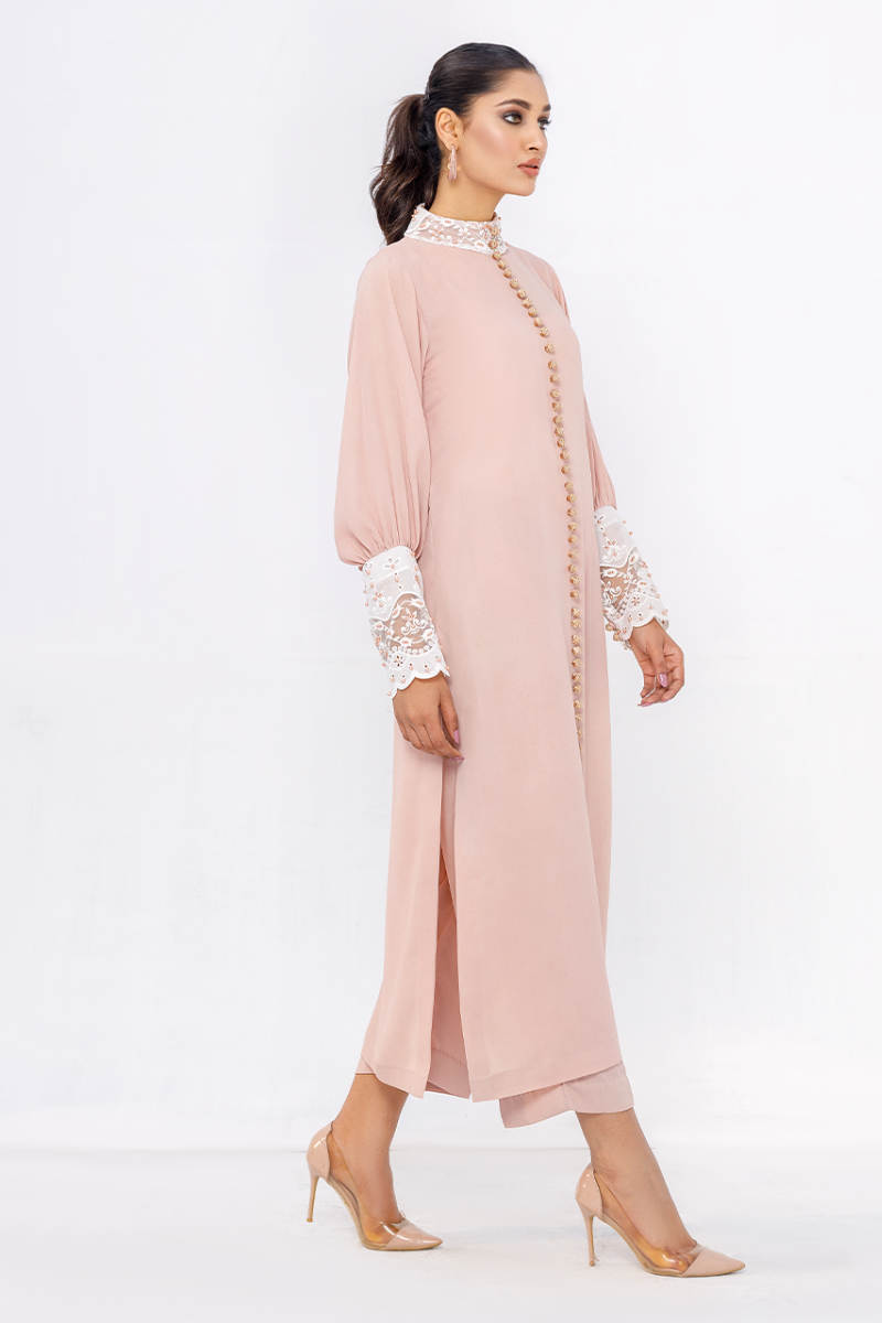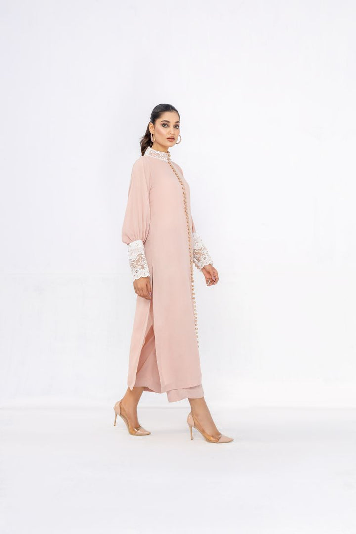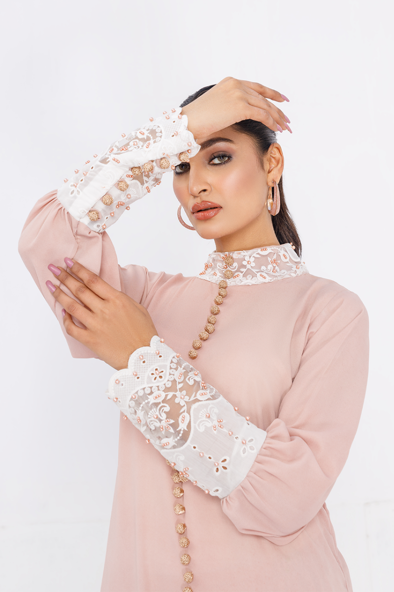 This pastel pink shirt is the perfect pick for a casual evening. An understated shirt radiating pure opulence with pearls work and lace finishing on the cuffs and collar.