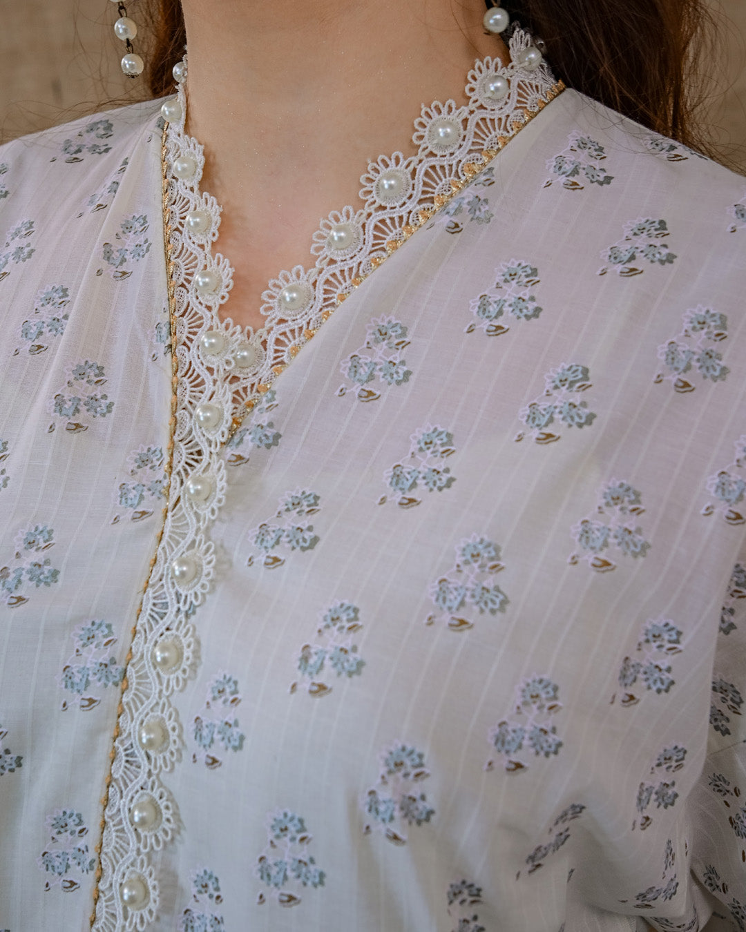 🌿 Top: Screen-printed dobby lawn shirt with dainty floral patterns, pearl-laced borders, and an embroidered neckline that adds effortless charm.