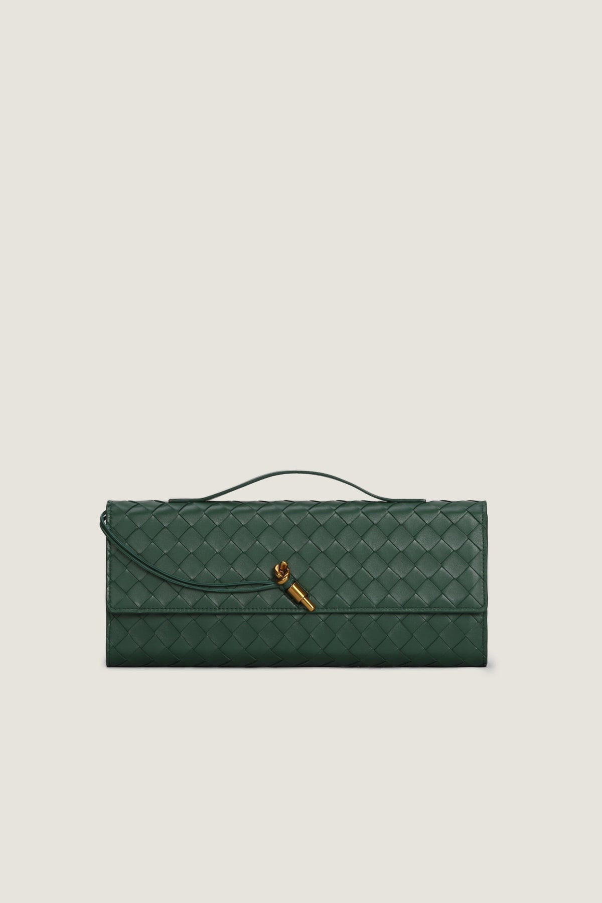 Elevate your accessories game with the Andiamo Clutch in chic green. Crafted from luxurious Intrecciato leather, this sleek and refined clutch boasts a top handle design and a stylish metallic knot closure. Plus, it includes an extra pocket perfect for storing essentials, combining fashion and function in one sophisticated option.