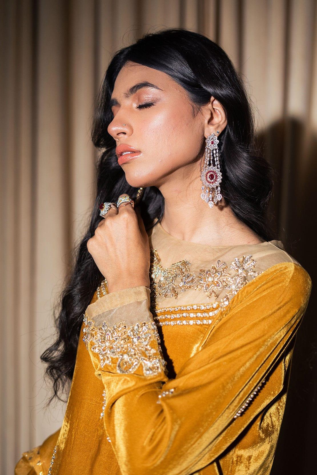 Marigold mustard velvet is used as a canvas for a long-length kurta. This sleek silhouette is ornamented with gold & silver tilla, naqshi, sequins and pearl work and paired with an organza dupatta entailing zari borders.