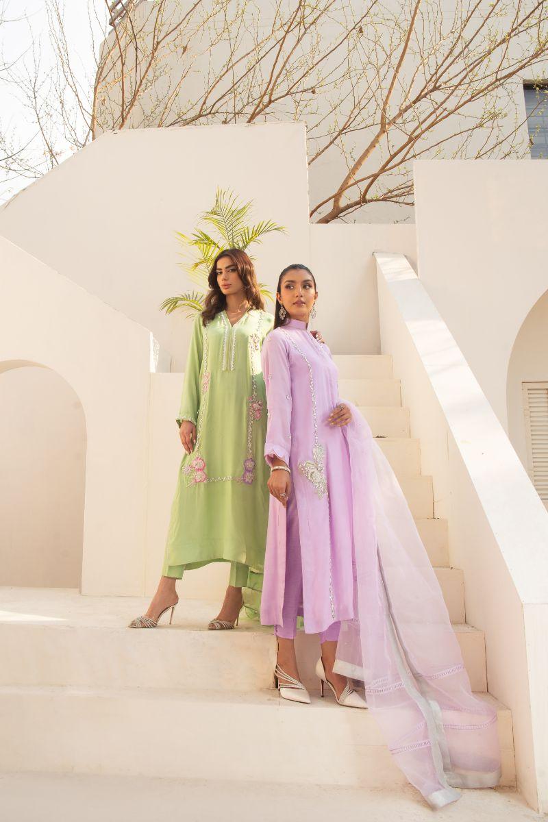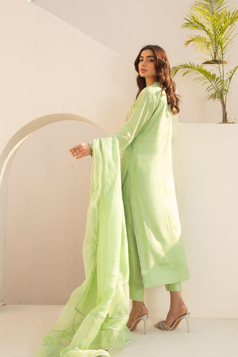 Behold this exquisite ensemble crafted from lush green Sheesh Silk, featuring a straight-cut shirt adorned with intricate hand-embellished crystals, 3D ribbon work, dabka, and Swarovski elements. Paired with a luxurious silk dupatta finished with delicate organza details, it exudes an aura of elegance and sophistication, making it the perfect choice for any special occasion.