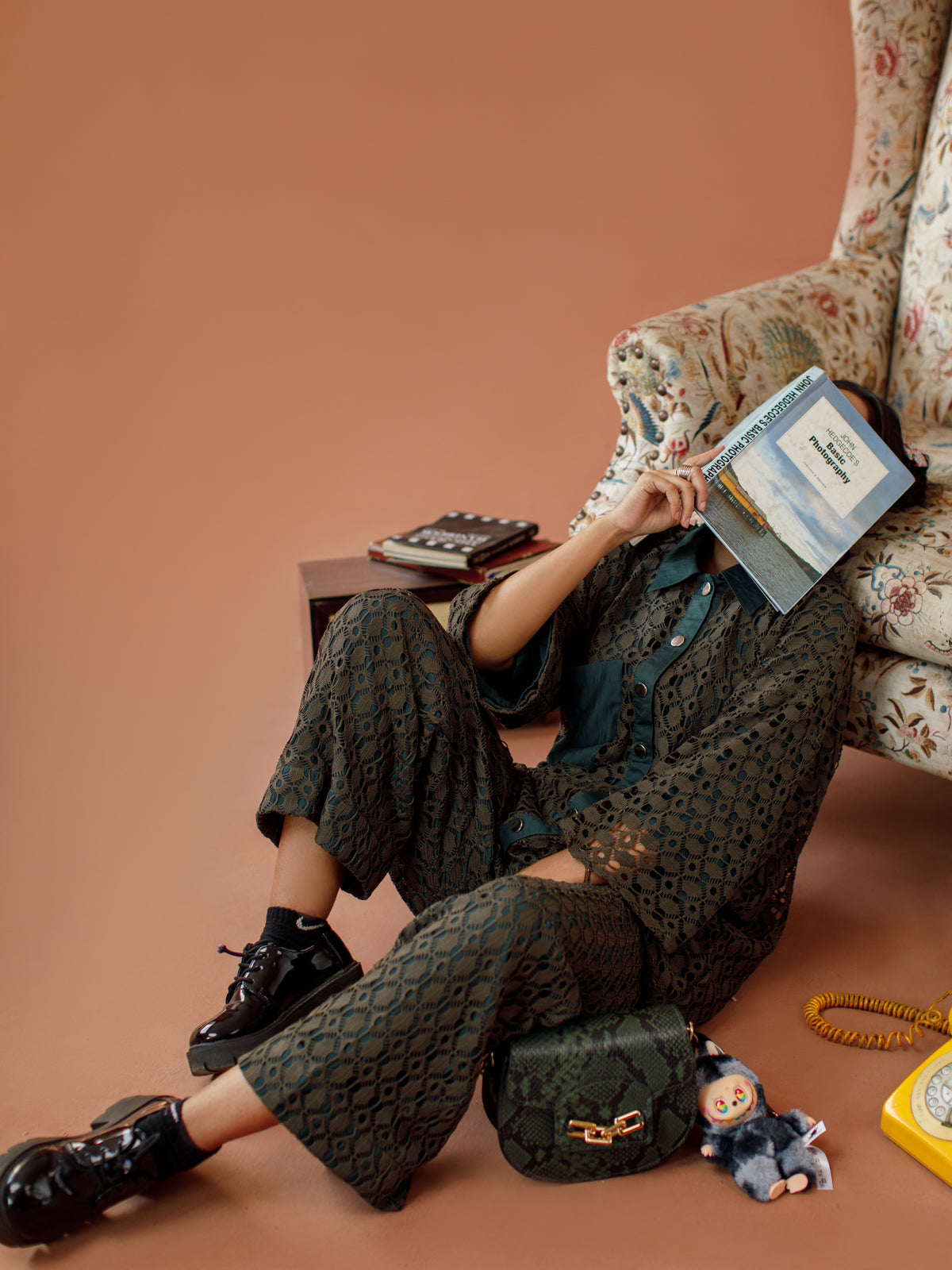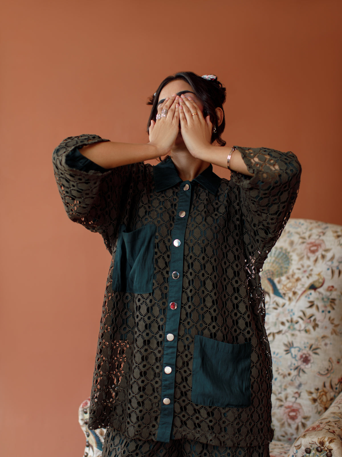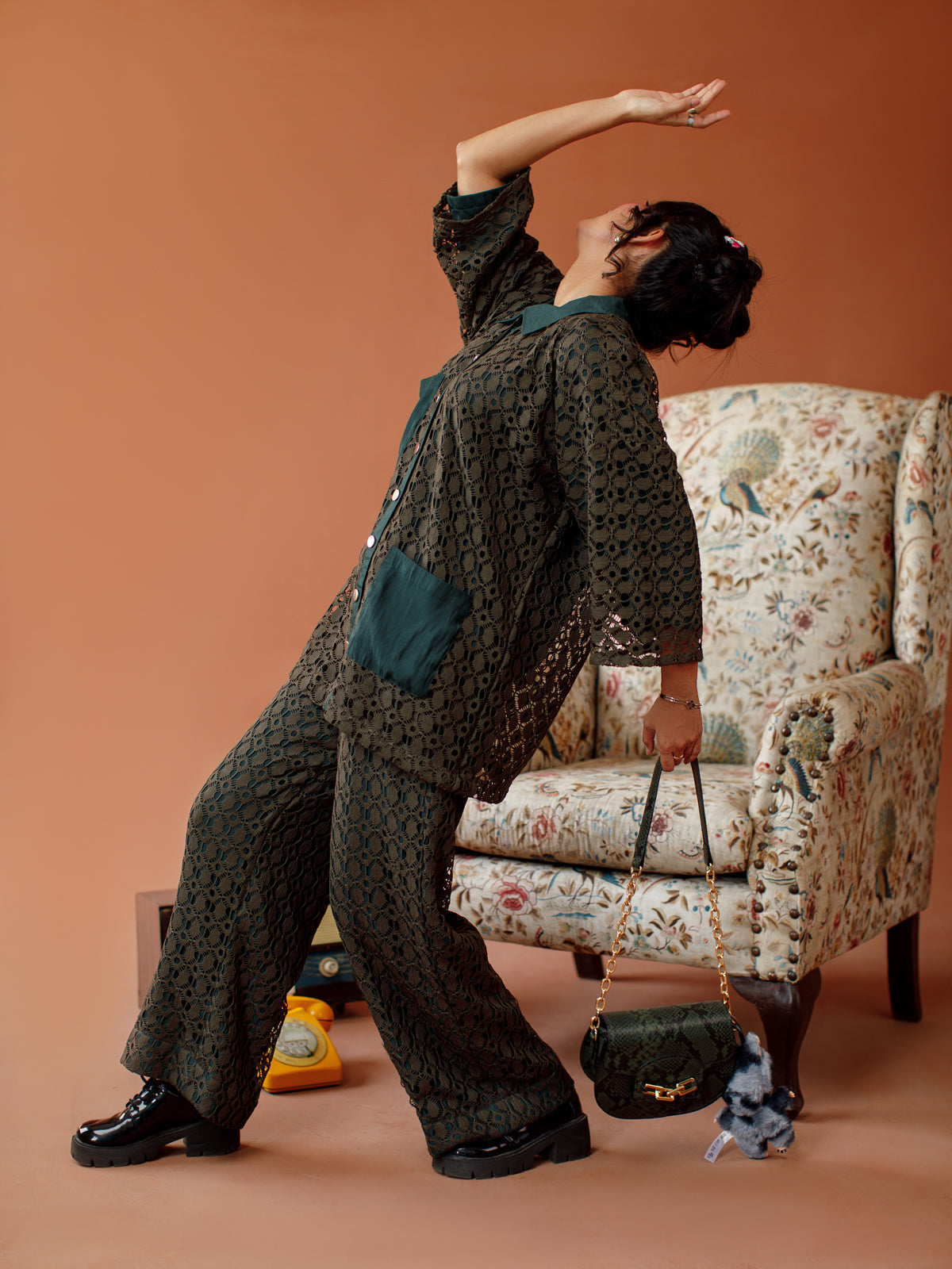 Ombrella - Olive Decode Olive cotton blend lace Co-Ord Set For Women - 2 Piece