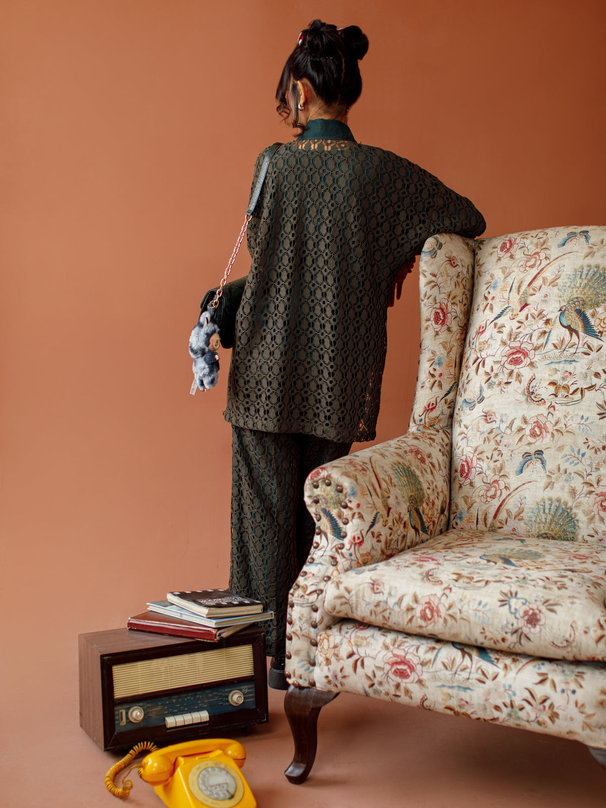 Sheer meets chic in this green net coord set—featuring a short, baggy shirt with sleek silver buttons and full lining, paired with flowy flared pants in matching fabric. Effortlessly cool with a classy twist.