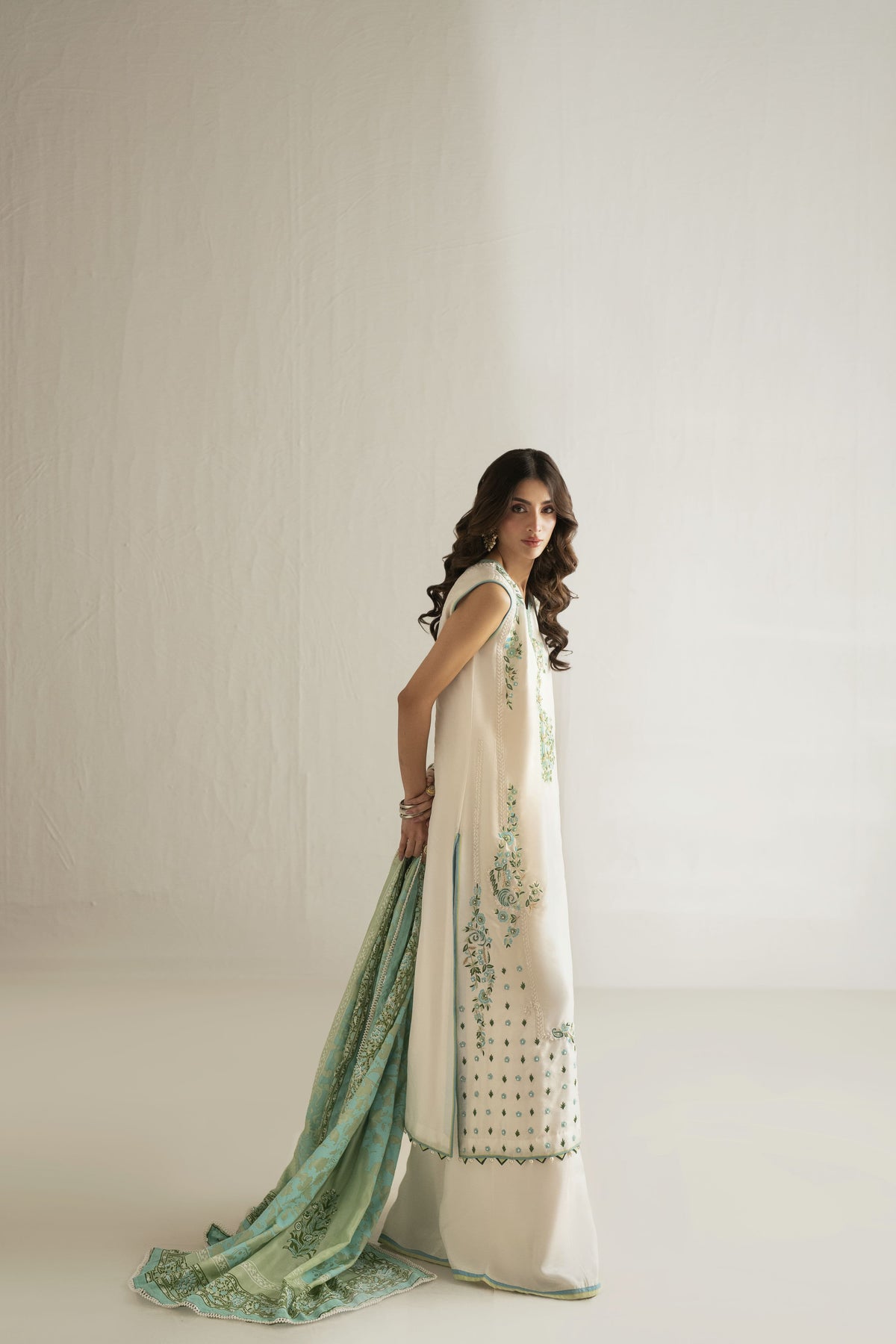 A white pure raw silk shirt enriched with soft green and ferozi shaded detailing, paired with a classic white dhaka and a pure silk block-print dupatta for timeless festive elegance.