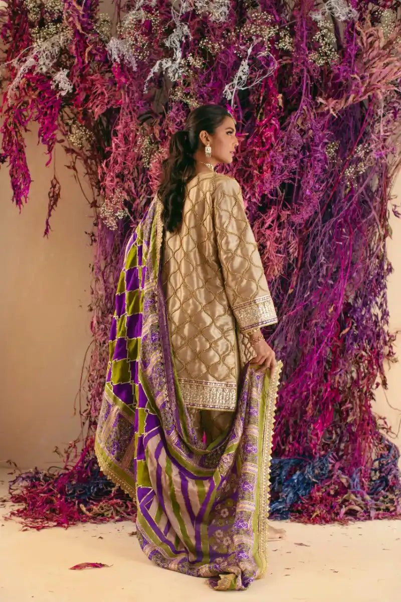 Tea pink & purple shirt with gotaa detailing paired with shalwar & blockprinted dupatta