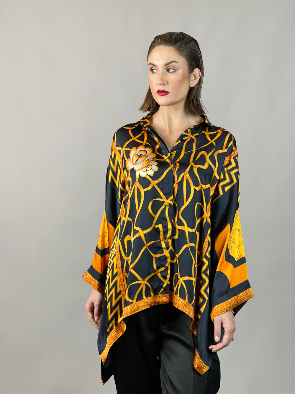 Maheen Khan - Rose Black Scarf Baggy Shirt - BLACK GOLD - Blended Silk - 1 Piece