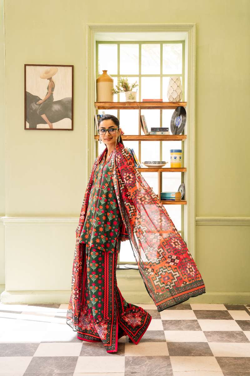 Maria Osama Khan - Georgette & Tissue Silk Bloom Suit For Women - bottle green - 3 Piece