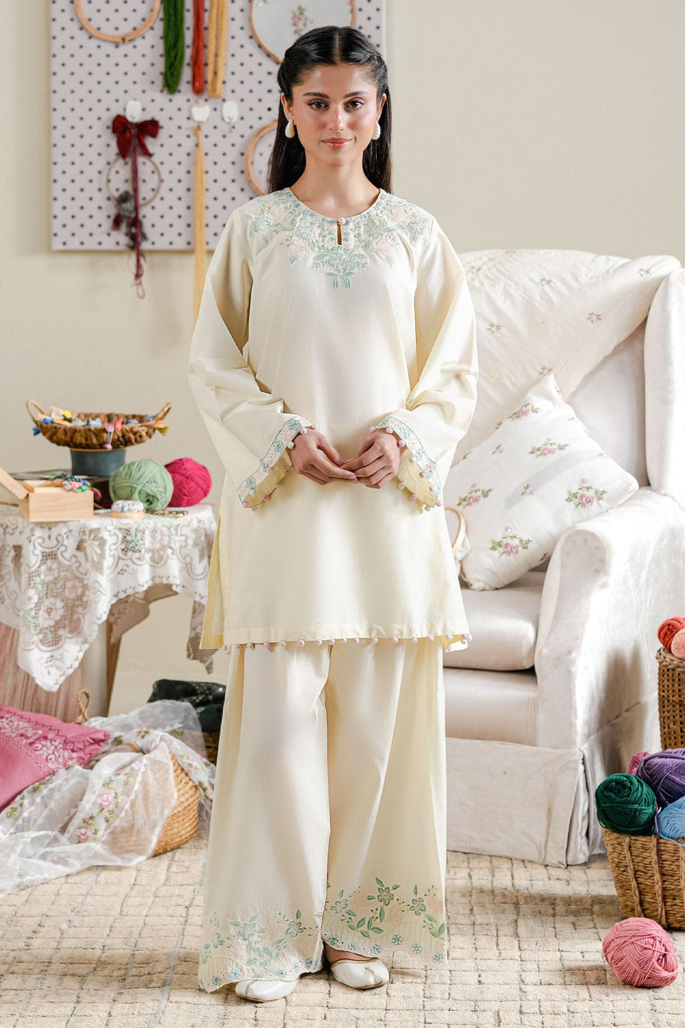 Cross Stitch - Mellow Thread Cambric Suit For Women - Yellow - 2 Piece