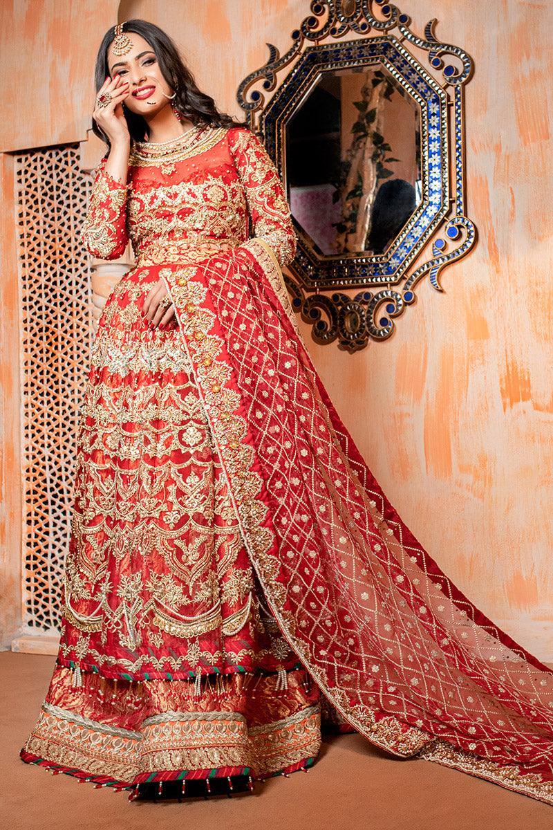Glorious tangerine orange bridal lehnga outfit with floral geometric pattern outlined heavily embellished in dabka, zari and beadwork along with sparkling sitara chatta and mirror work all over and around the daaman flare border in dazzling diamond shapes, fully embroidered organza dupatta in scallop border (3 pc stitched outfit)