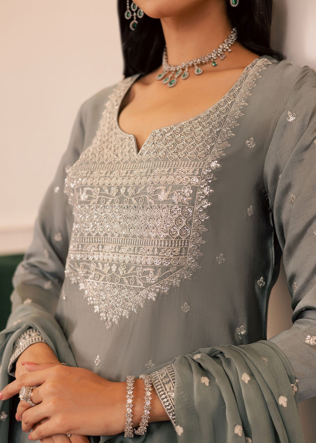 A statement in quiet sophistication — this three-piece outfit is designed in an ash grey tone, offering an elegant and calming aesthetic. The straight-cut shirt features detailed embroidery across the bodice, highlighted with delicate threadwork and shimmering accents that add subtle luxury without overpowering the look.