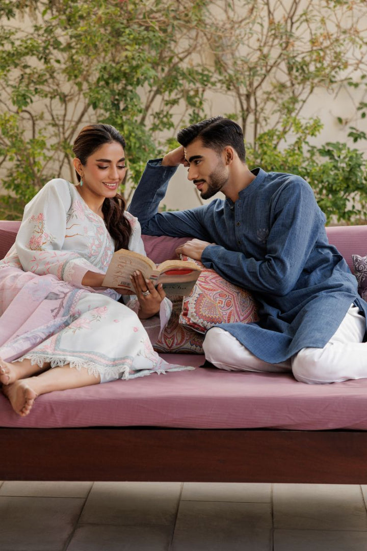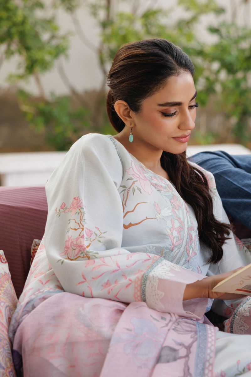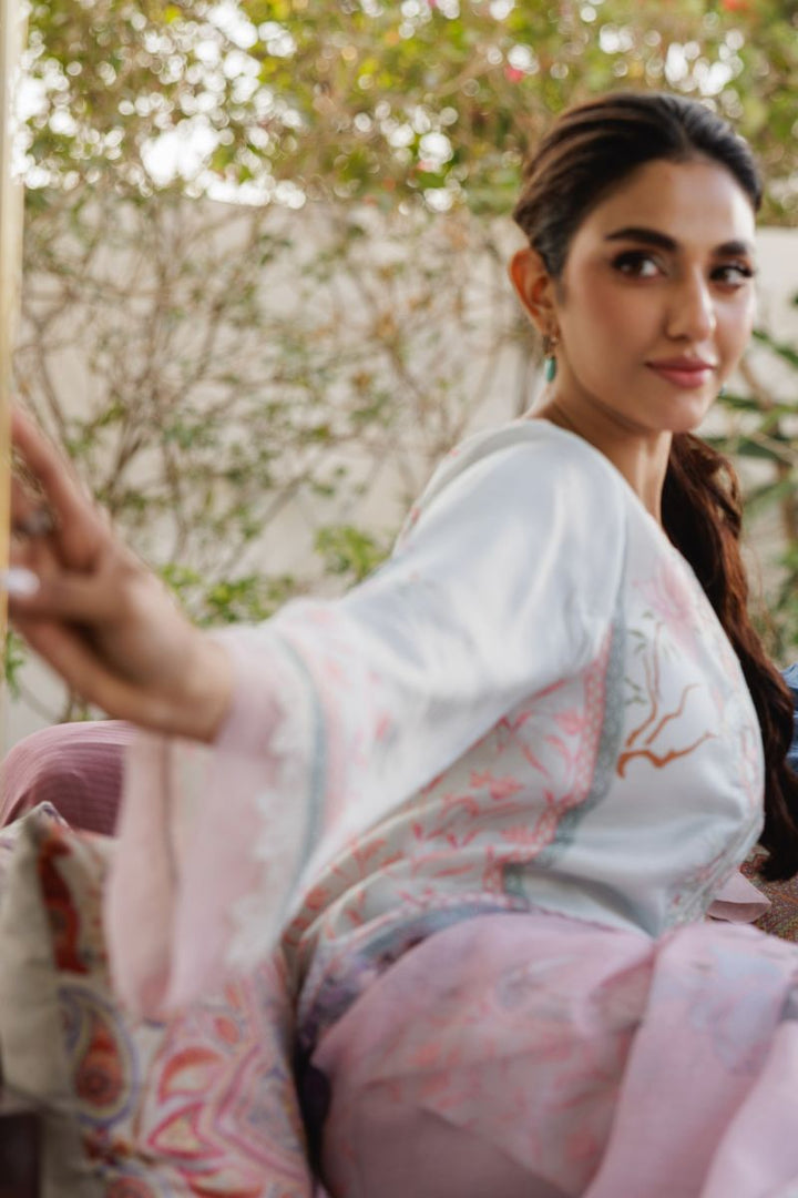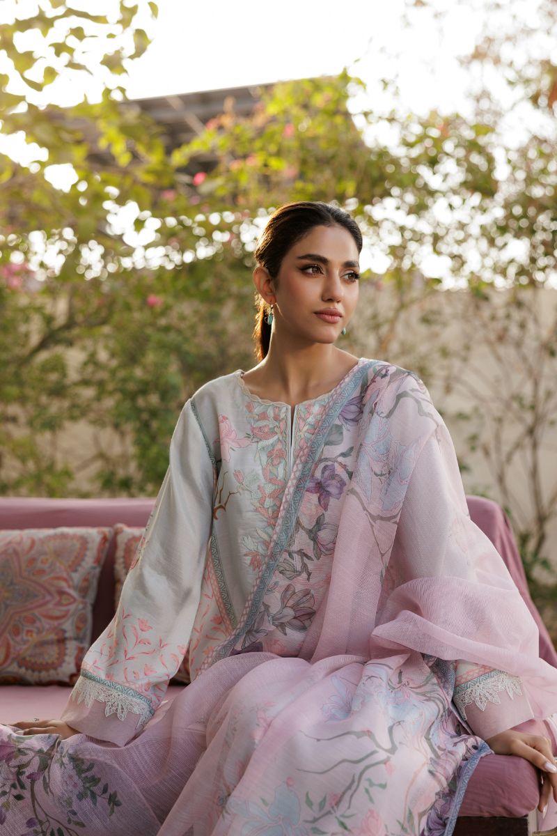 The print draws inspiration from china porcelain and ink painting. The delicate neck embroidery adds to the fragile essence of the entire piece. Printed bamber silk shirt (front back and sleeves) 3 Meters - Dyed bamber silk trousers 2.5 Meters - Printed cotton net dupatta 2.75 Meters - Embroidered neckline - Laces for shirt -
