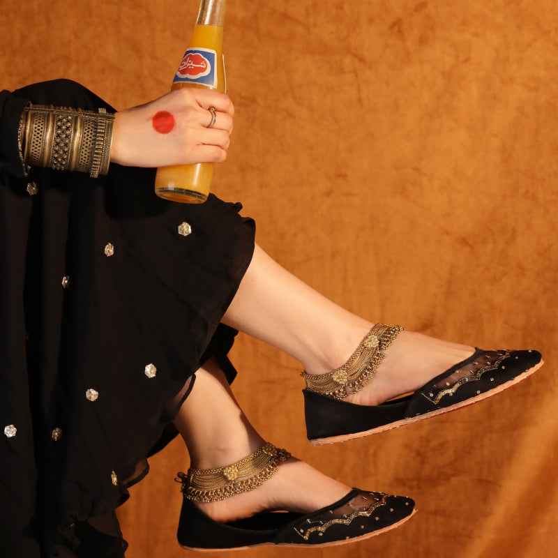A starlit edit with a sheer net overlay, scalloped neckline, and tiny sitara sequins that catch the light. Soft velvet base, cushioned insole, and a flexible leather for effortless festive wear.