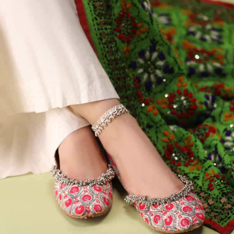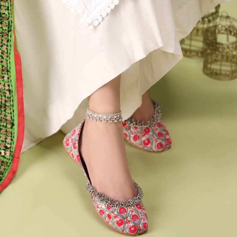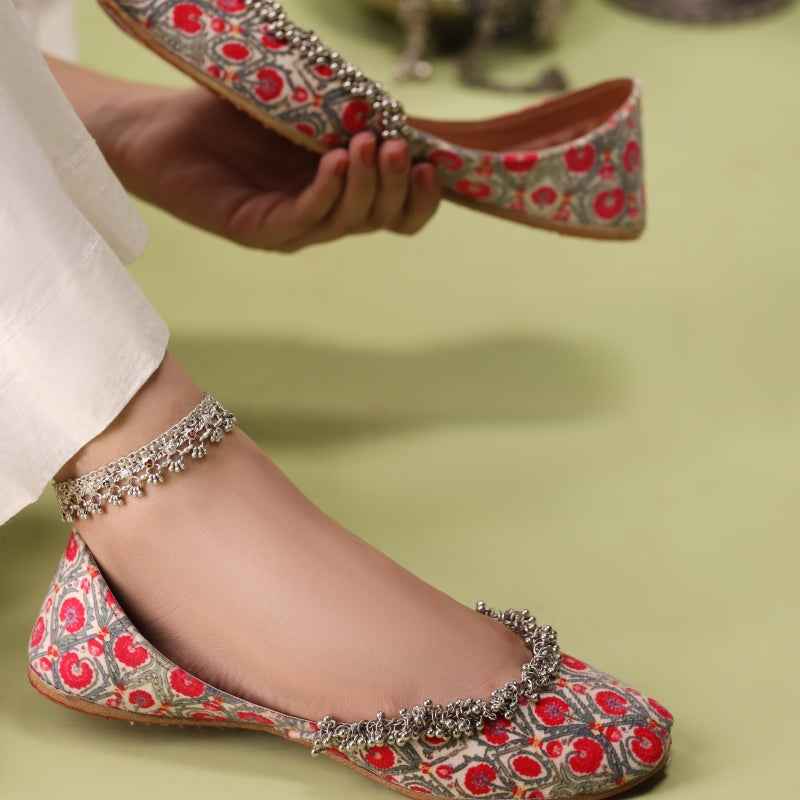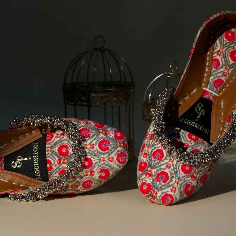 Our Pomegranate Lattice khussa features bold ruby-red pomegranate motifs digitally printed on velvet, drawing inspiration from traditional block-printing techniques and is framed by a delicate metallic-bead fringe that catches the light with every step.  As each pair is assembled entirely by hand, slight variations in print intensity and bead placement make yours truly one-of-a-kind.  Style them with crisp white linen trousers and silver anklets for a vibrant daytime look, or let the ruby-red lattice pop against a charcoal kurta for evening allure.  To keep them looking their best, gently spot-clean with a damp cloth and store in a cool, dry place away from direct sunlight.
