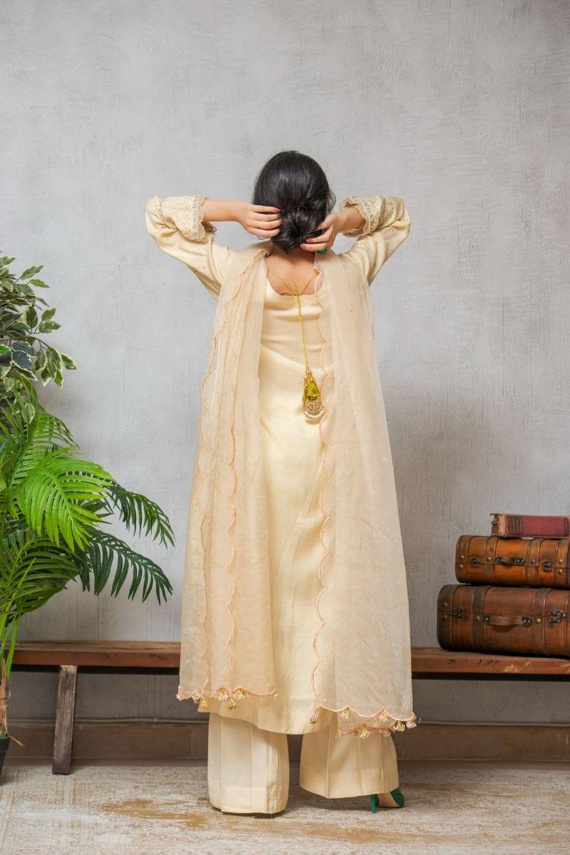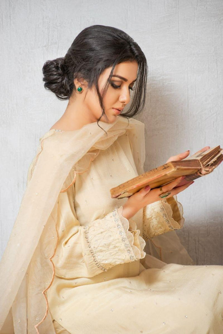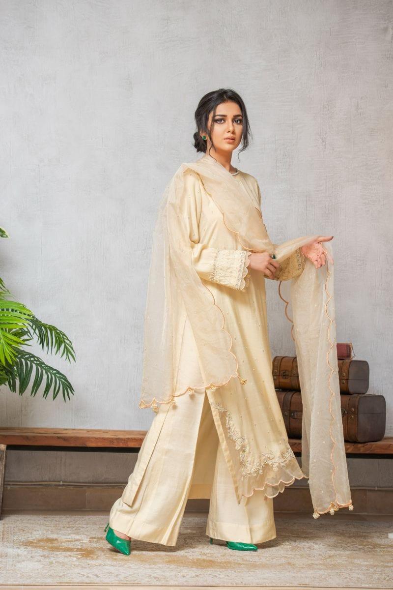 Shirt Material: Silk Detail: Ada work Pearls/Moti, Sequence Dabkaon Arms, Sleeves and daaman. Pearls chatta all over shirt.
