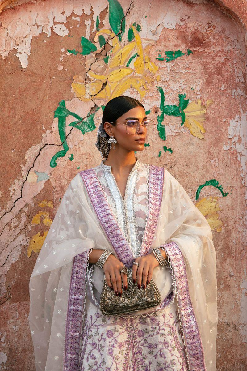"Azara" presents our traditional off-white shirt and gharara ensemble. The chikankari kameez boasts intricate silk thread embroidery, adorned with embellishments such as panni tilla and gota ashrafis. The sleeves are adorned with elaborate panni tilla embroidery. Complementing the ensemble is a digitally printed charmeuse silk gharara, featuring thick borders of gota and lappa. Paired with a matching off-white chiffon dupatta, adorned with panni tilla borders on all four sides and motifs scattered across the fabric. This illuminated ensemble is a classic silhouette meticulously draped to create an enchanting look.