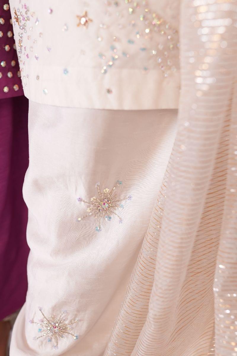 Organza shirt, korean shalwar, pure zari organza dupatta Added shine of a twilight stars and sequins multi shine stones on a white organza shirt to make your occasion more sparkly and its paired with snow flick flower shalwar and pure organza tissue finished dupatta.