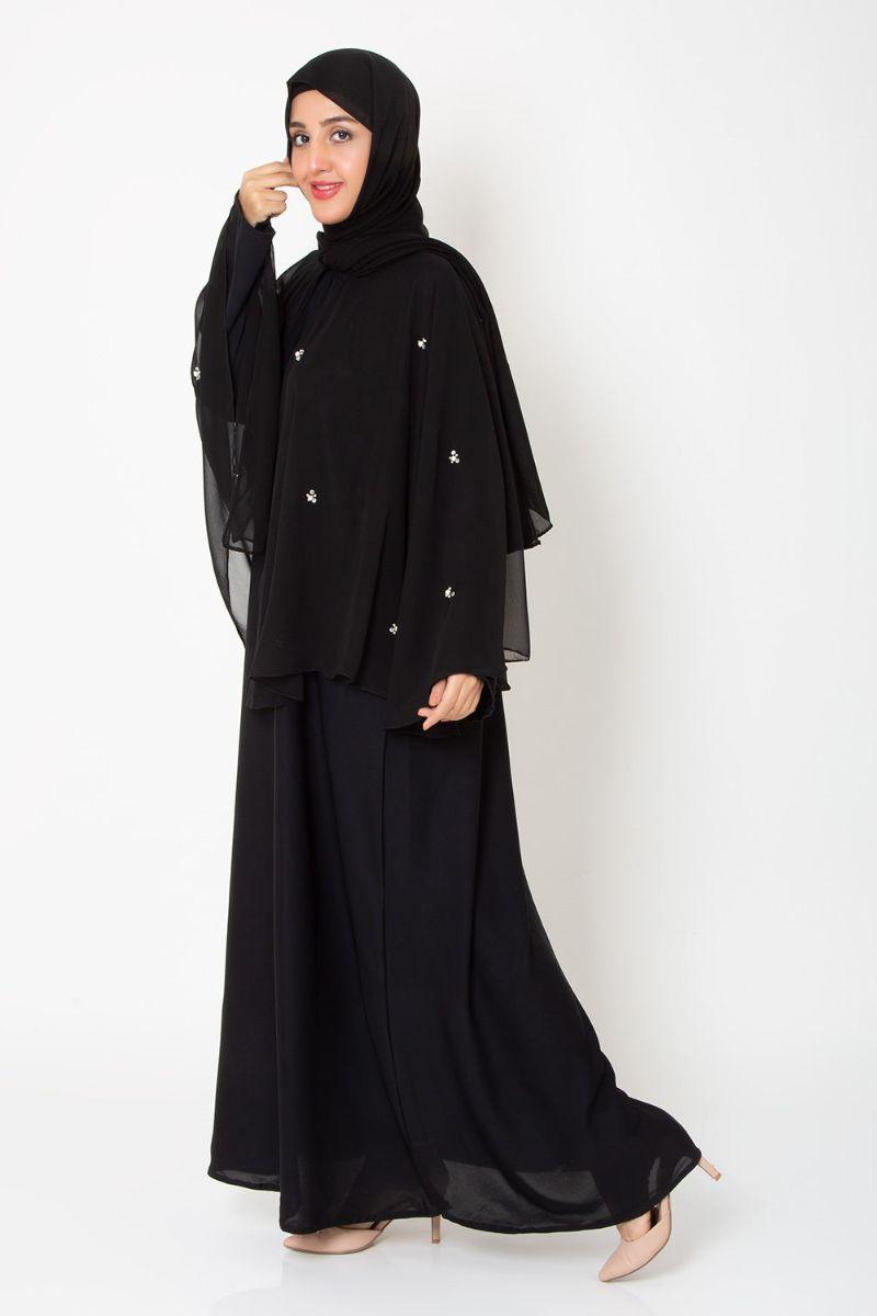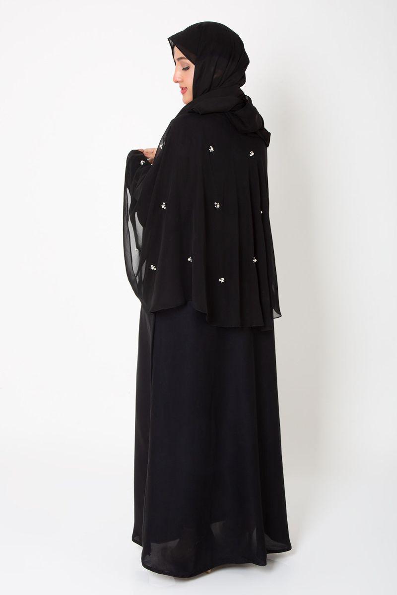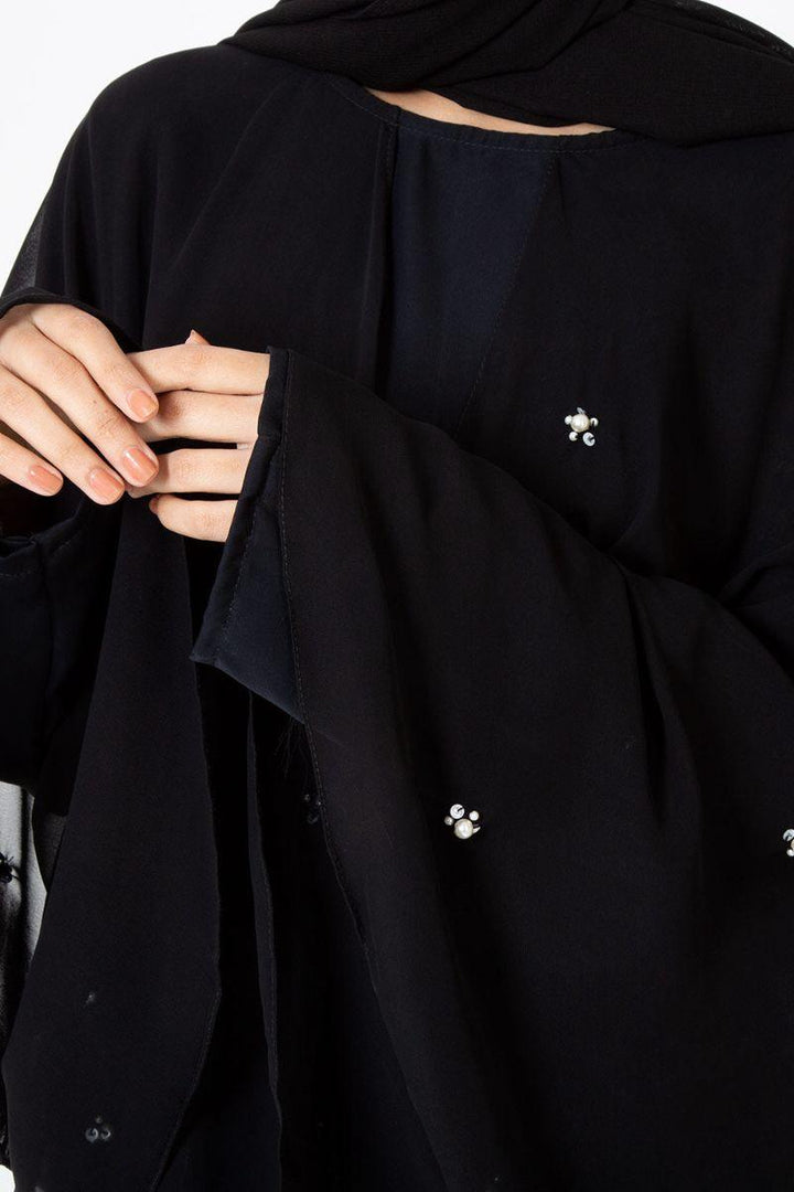 Product Description:  This modest Azekeh abaya features chiffon bask on its shoulder with shiny pearls and sequence work.