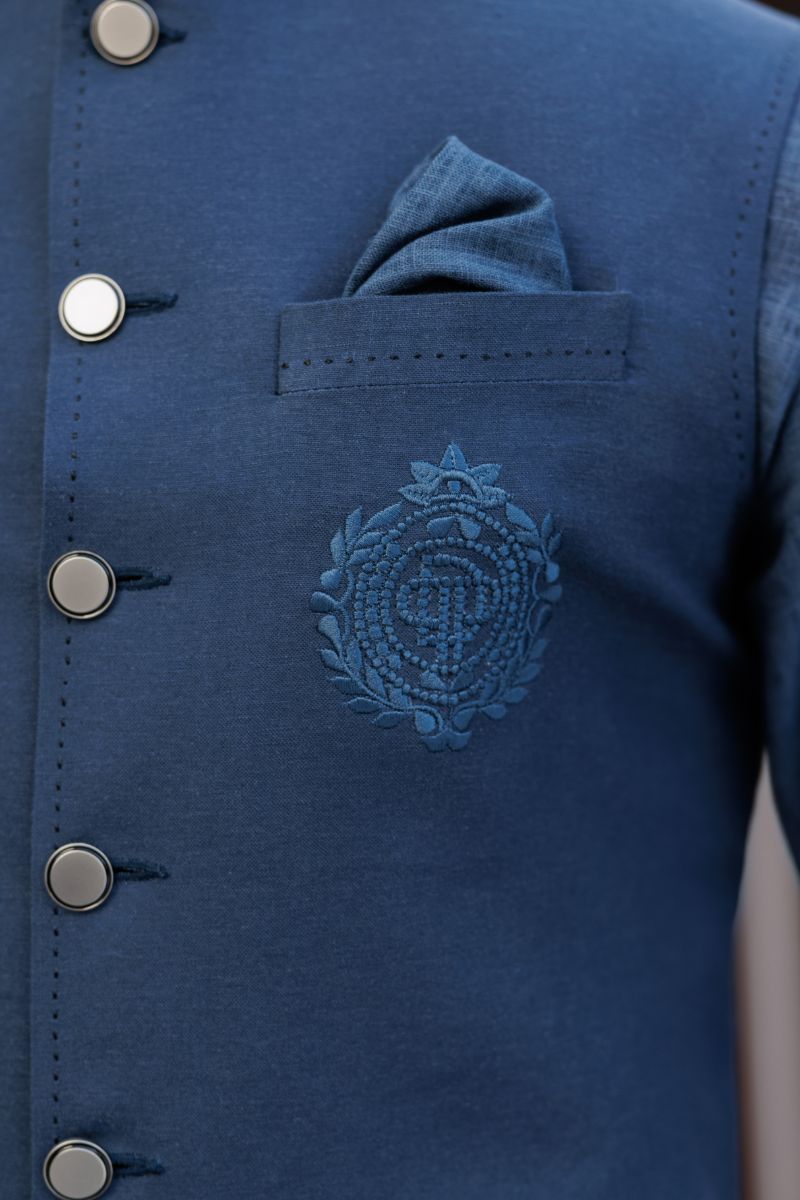 This navy blue suiting fabric waistcoat exudes sophistication and luxury, featuring iconic DP logo and embellished with stunning buttons. The deep hue lends an air of timeless elegance, while the bold DP logo add a touch of signature style.