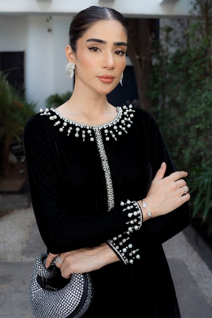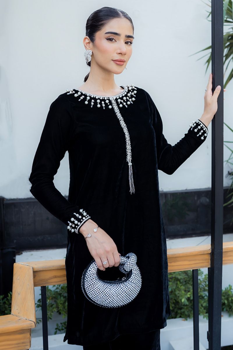 Pearl Eclipse captures timeless glamour in black velvet. The short straight shirt and matching cigarette pants create a chic, tailored silhouette, while delicate hand embellishments and statement pearls add a whole lot of sparkle. Ideal for those seeking elegance with a modern twist.