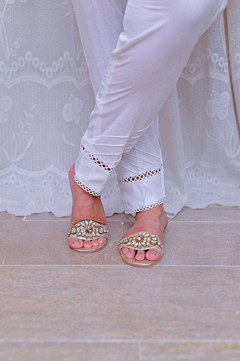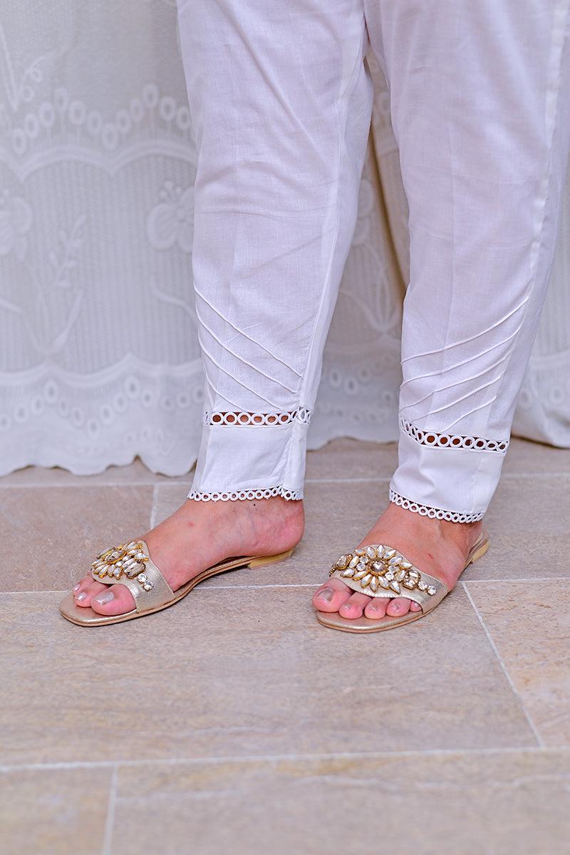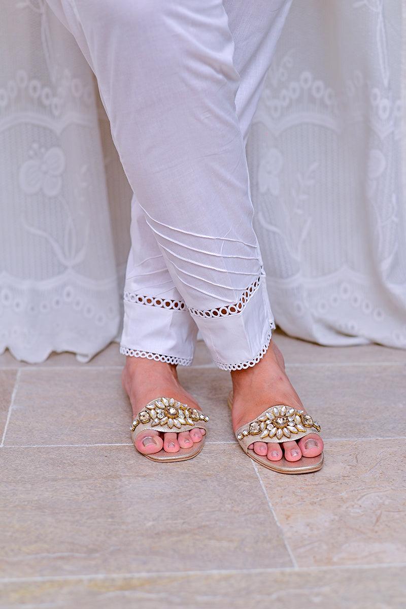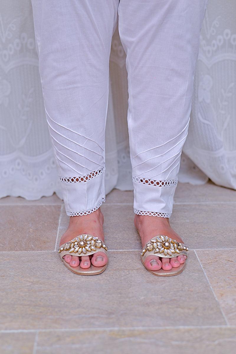White cotton trouser styled gracefully with lace. Completing your essentials segment in the wardrobe. Disclaimer Product color may vary due to lighting, screen pixel and color settings.