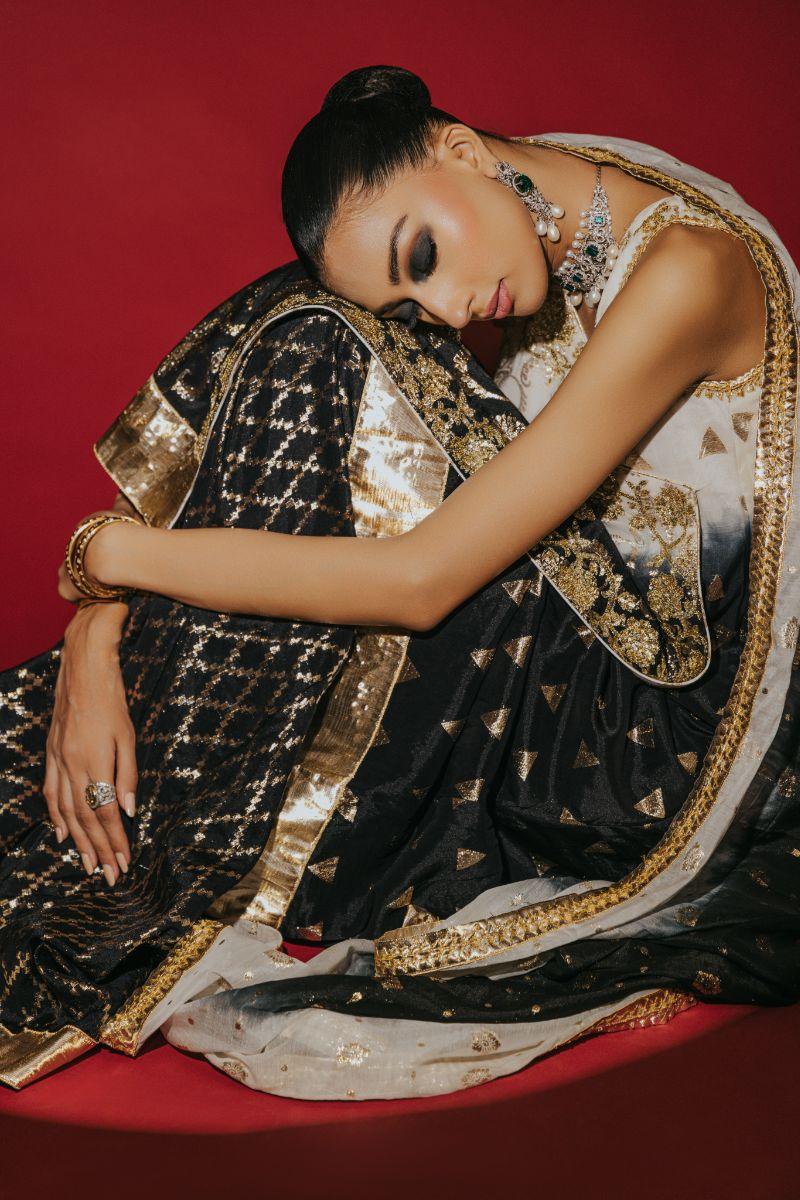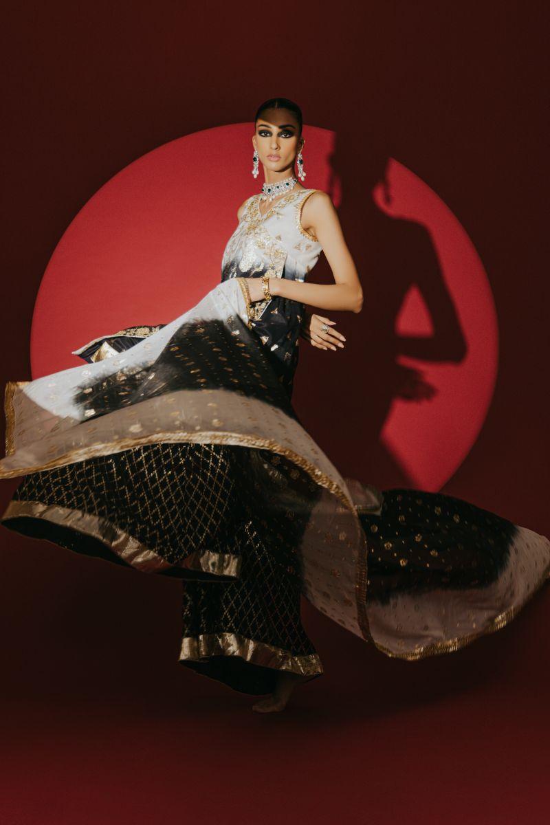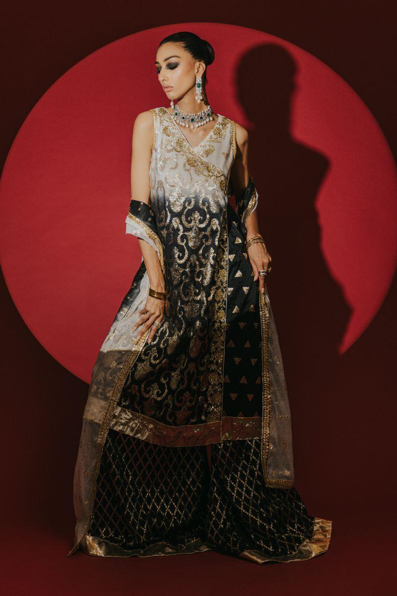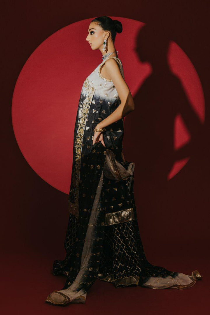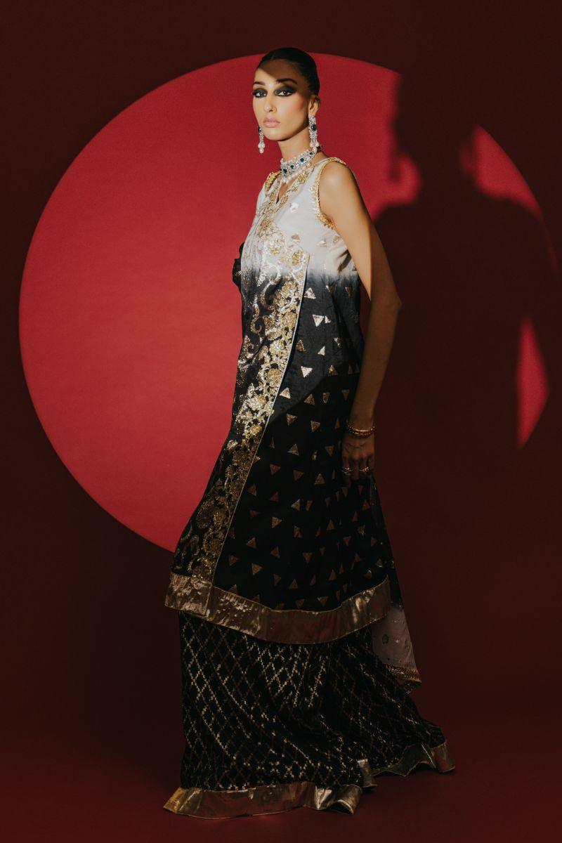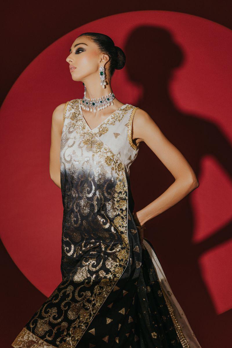This outfit features a hand-woven jacquard fabric, known for its intricate patterns and texture, crafted on a traditional loom. The ensemble includes a dupatta and shirt that have been dip-dyed, creating a gradual blend of color. The shirt is elegantly embellished with delicate sequins, adding a touch of sparkle and sophistication to the overall look. This combination of traditional weaving techniques, modern dyeing methods, and subtle embellishments makes the outfit both stylish and culturally rich, perfect for occasions where you want to showcase timeless elegance with a hint of contemporary flair.