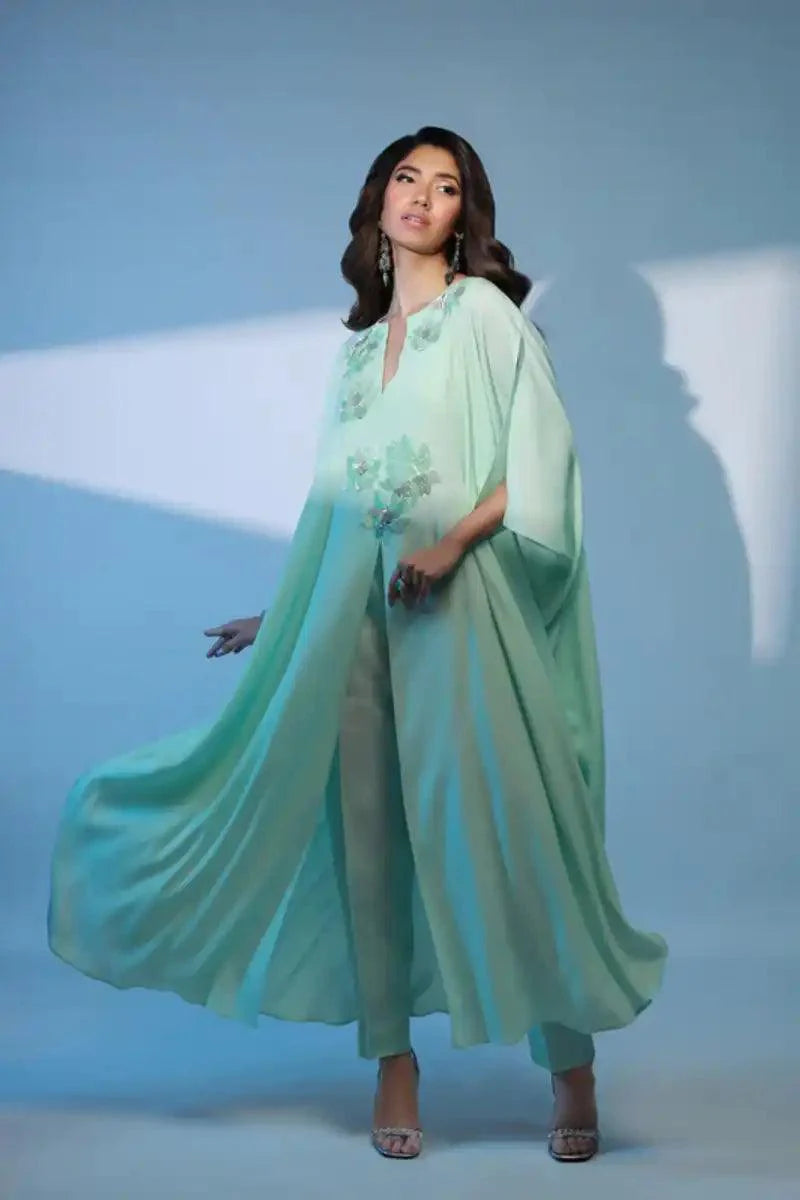 A Halo of Light. A georgette crepe top, a silk camisole paired with pants. Ornamented with sequin, thread and crystal handwork.