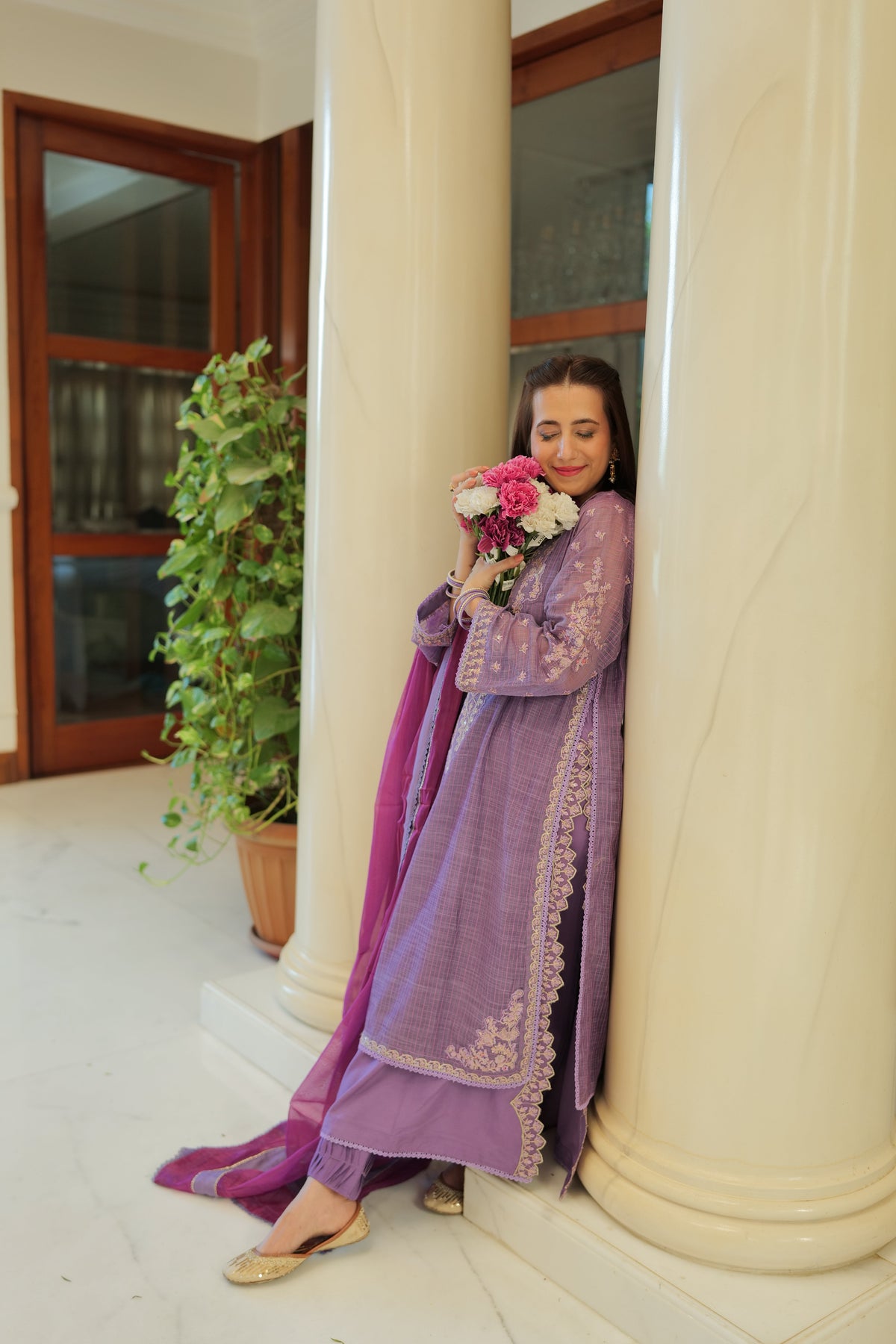 A sophisticated and feminine lavender Munar line shirt, layered over a separate inner shirt that boasts scallop cutwork embroidery on the chaaks, offering a unique textural contrast. The main shirt is delicately adorned with GPO lace, lending an ethereal touch. The look is enhanced with a contrasting magenta Maysuri dupatta, designed with lavender accents and intricate lacework for a refined finish. The matching cotton silk straight pants feature pintucks detailing, ensuring a seamless and elegant silhouette.