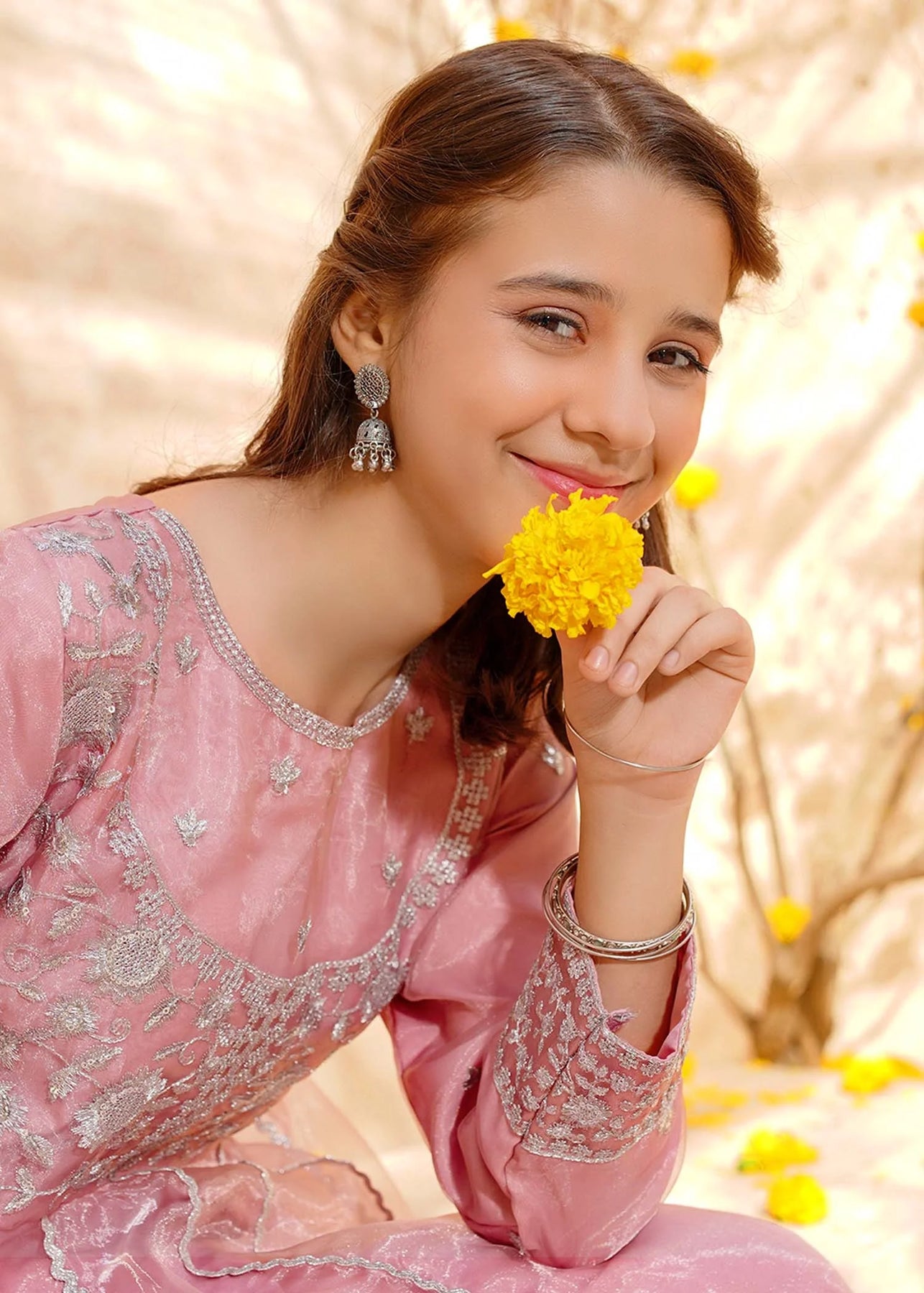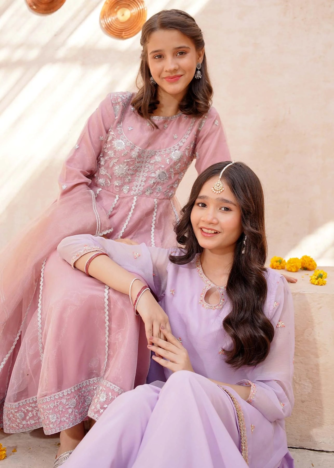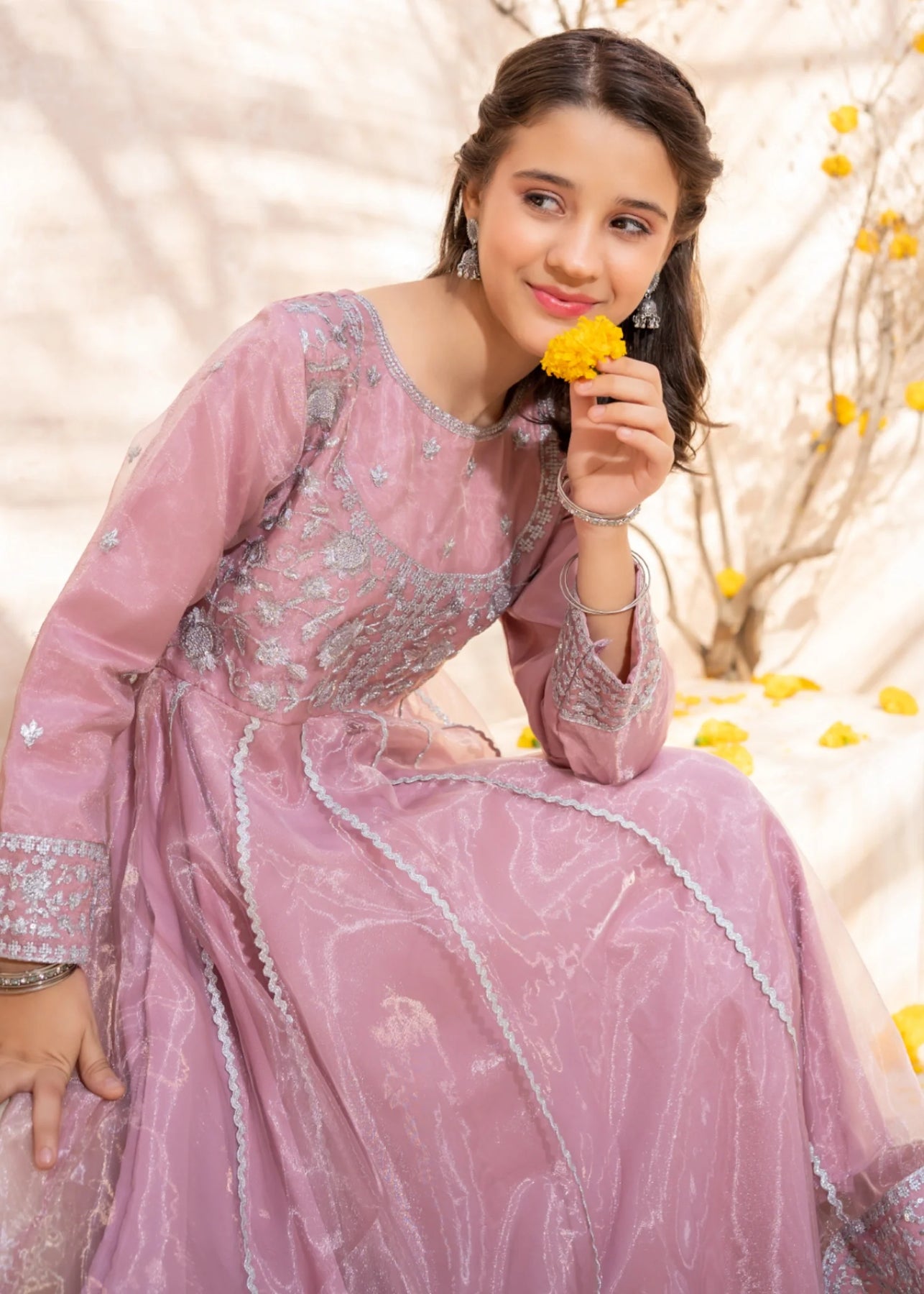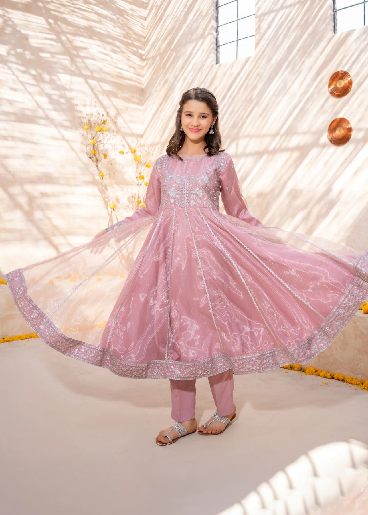 Modest - Tissue Pink Embroidered Frock For Girl - 3 Piece