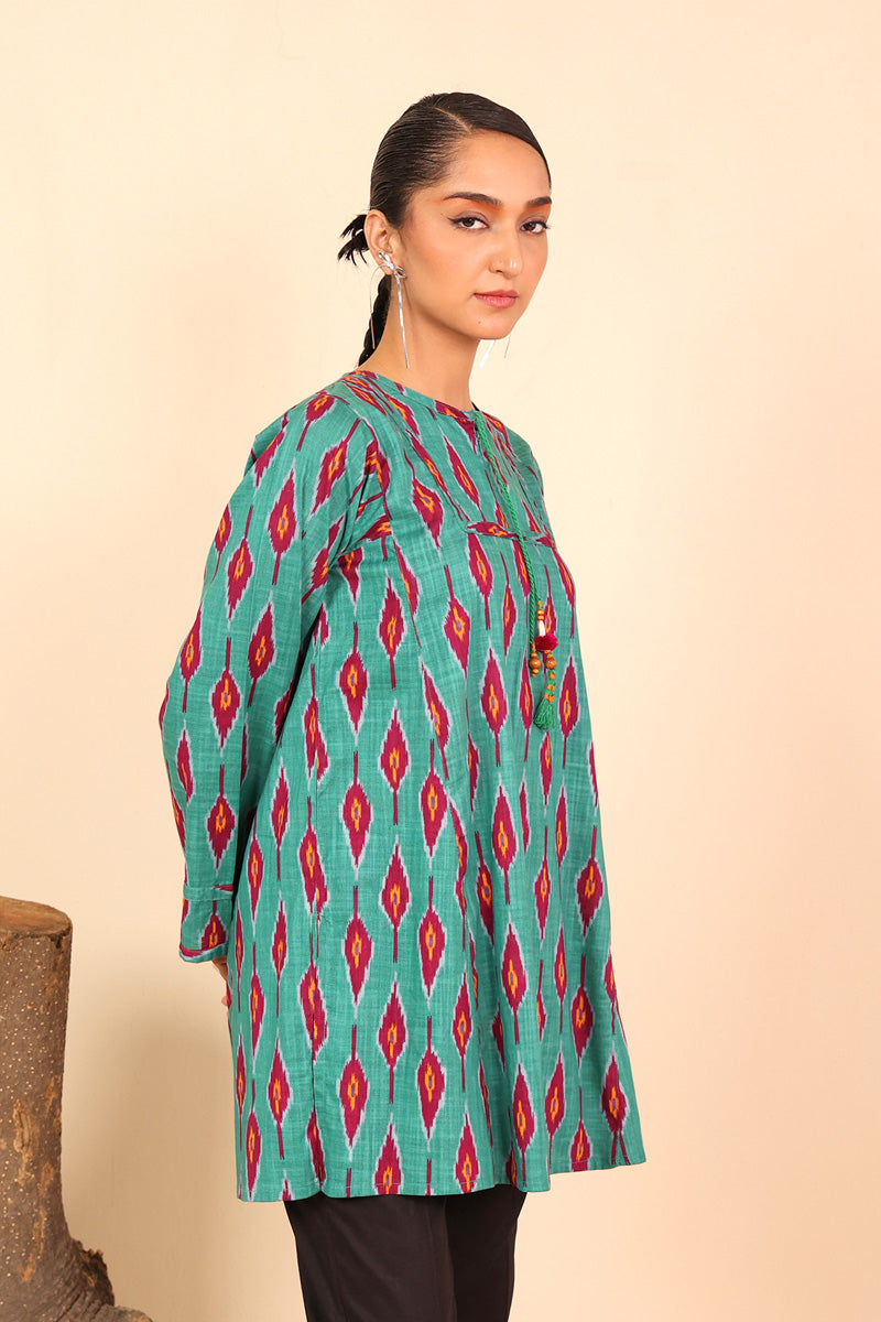 A loose fit printed short kurti with round neckline, featuring tassel and printed piping details on the front bodice and sleeves.
