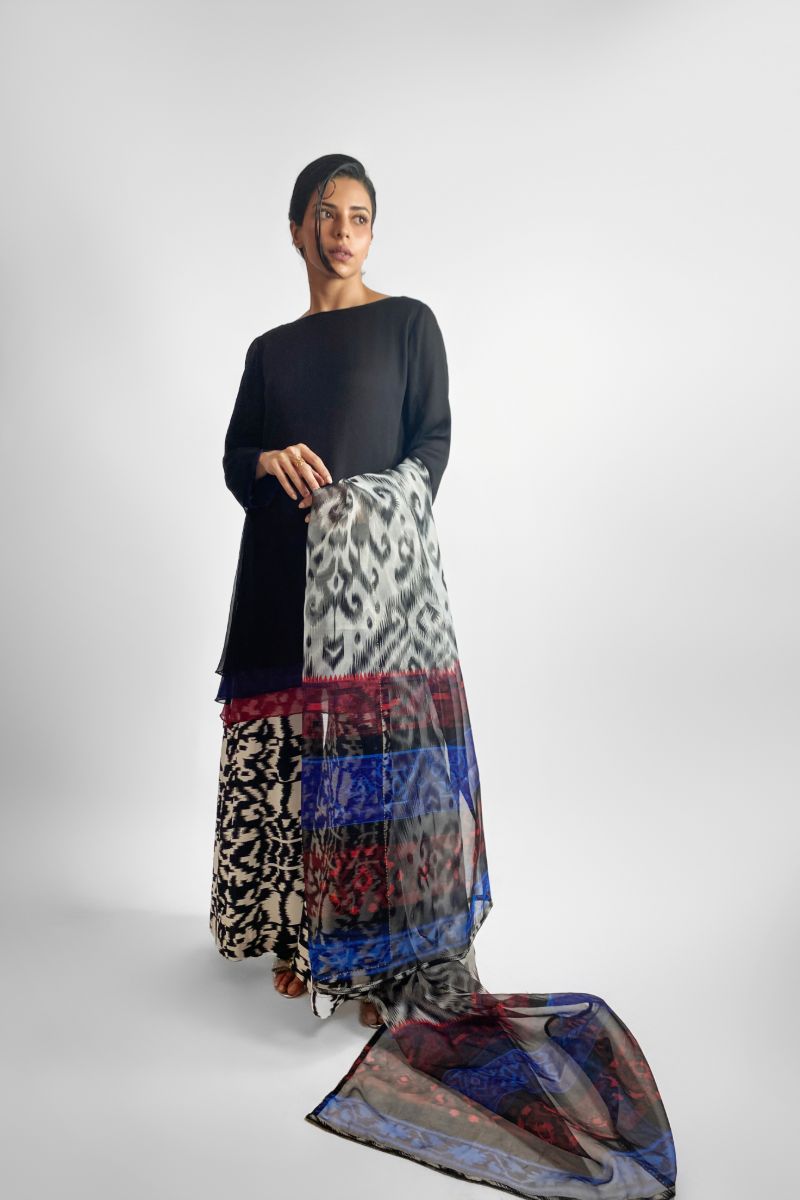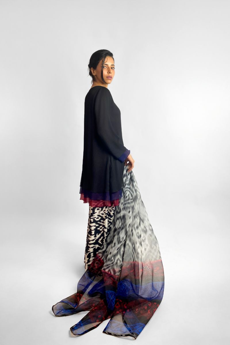 A long length elegant tunic cut on a princess line with black shimmer panels on the sides.paired with straight pants . (this is includes 2 piece suit with stitched)
