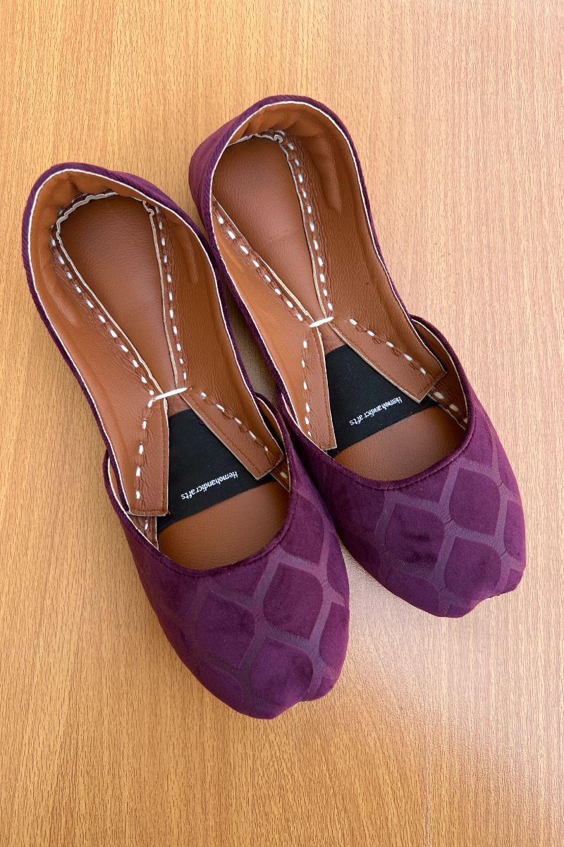 Too glam to give a damn. Soft and comfy "Resin Purple Velvet Khussa", and a pop up color with not only your eid wardrobe but also with your summer wardrobe. A pair that celebrates festivities and nature.Light weight, Soft Cushning, ECO friendly, No Blisters, Durable sole. Adorn your feet with best hand crafted khussa.