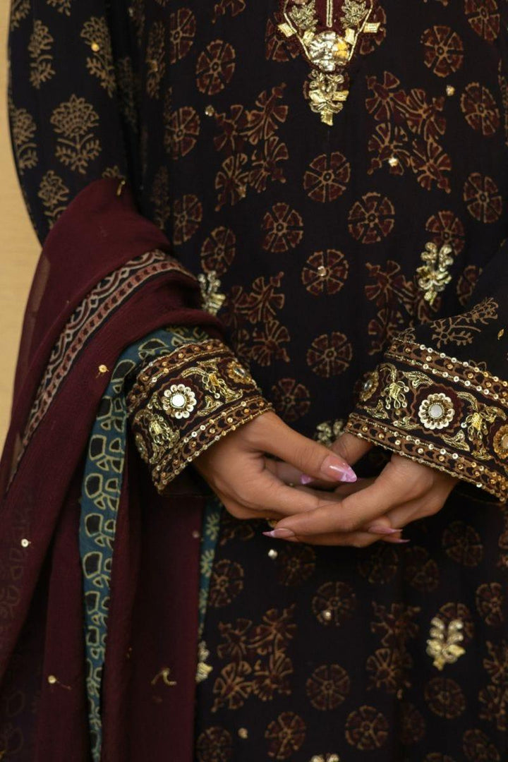 Insia Sohail - Ajrak Kurta - Earthly brown - 3 Piece - Chiffon