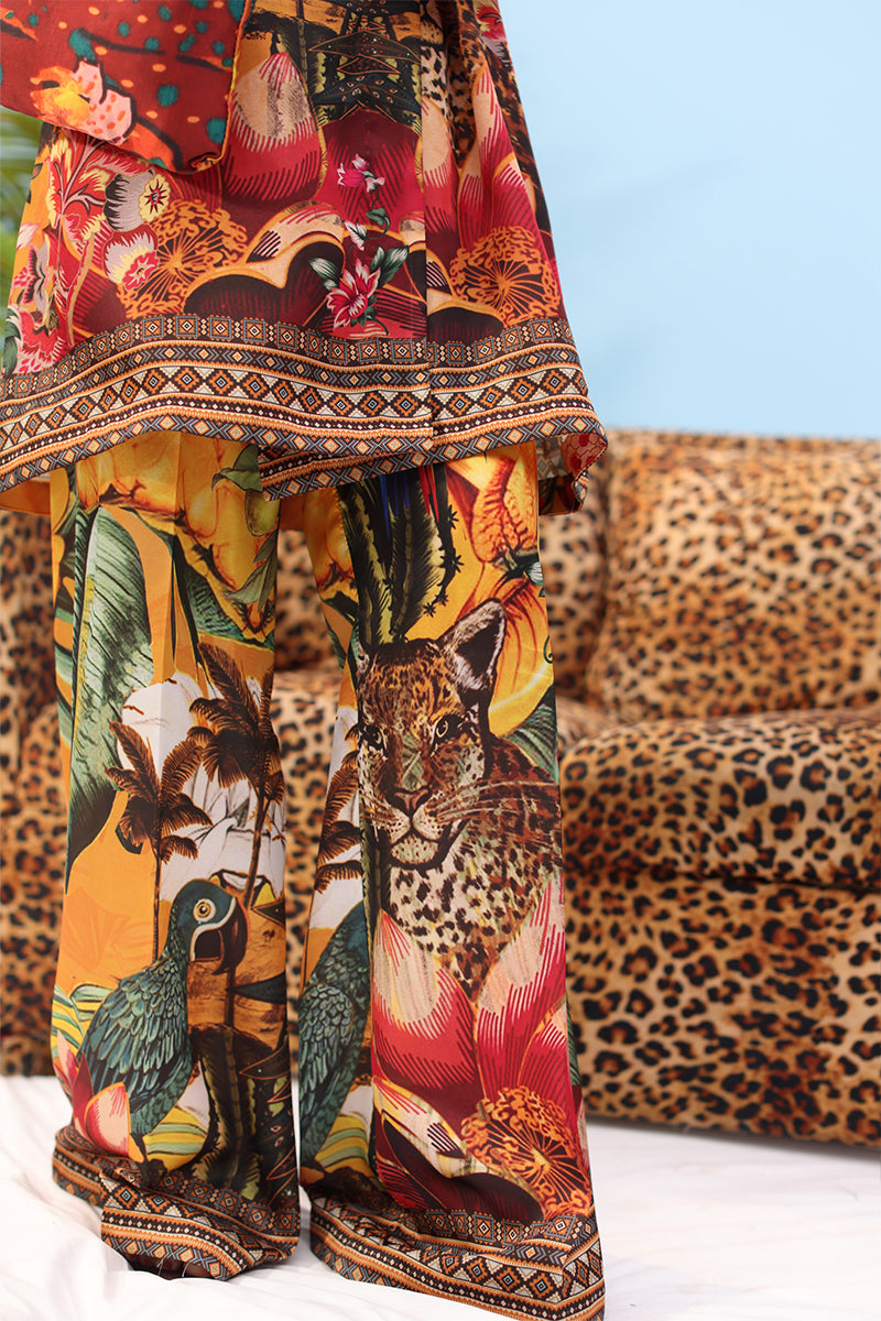“Rich and radiant, this creation embodies chic sophistication with its sculpted layers and fluid lines. The vivid golden canvas bursts to life with tropical artistry, while tailored accents and flared proportions reflect couture-level precision and thoughtful design storytelling.” Includes: Jacket & pants Add on: Matching pouch Fabric Details: Jacket: Premium Printed Silk ( Length = 34”) Pants: Premium Printed Silk ( Length = 44”) Size Customize: Yes Color Customization: NO Note: We have made every possible effort to display the color of the products accurately. However, the possibility of difference between the actual color and the display color might exist because of various types of screens and displays.