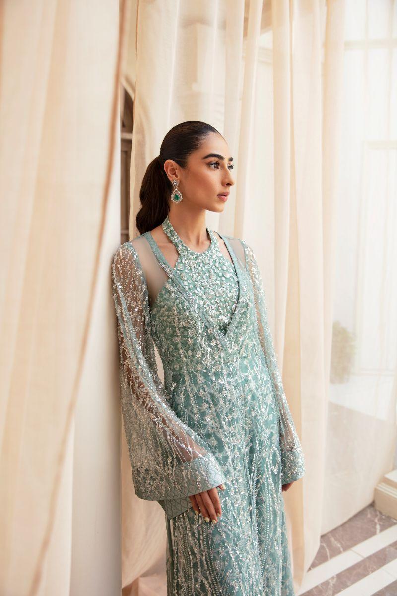 "Opulent Whisper." Epitomizing the contemporary MS design ethos, it's graced with dazzling embellishments and a resplendent kimkhaab finish, sculpting a silhouette that's both modern and timeless. Meticulously envisioned, the ensemble is accentuated by a flamboyant tinsel organza blouse beautifully embelished with delicate beads and intricate threadwork flowing perfectly, complimented with gorgeous chic bell-bottom pants to complete the sublime look. Jacket: Premium Bareeze net ( length 55’’) Pant: Premium korean silk ( length 46'') Blouse: Tinsel organza ( length 14") All Fabrics are manufactured to the highest standards of quality that are MS approved