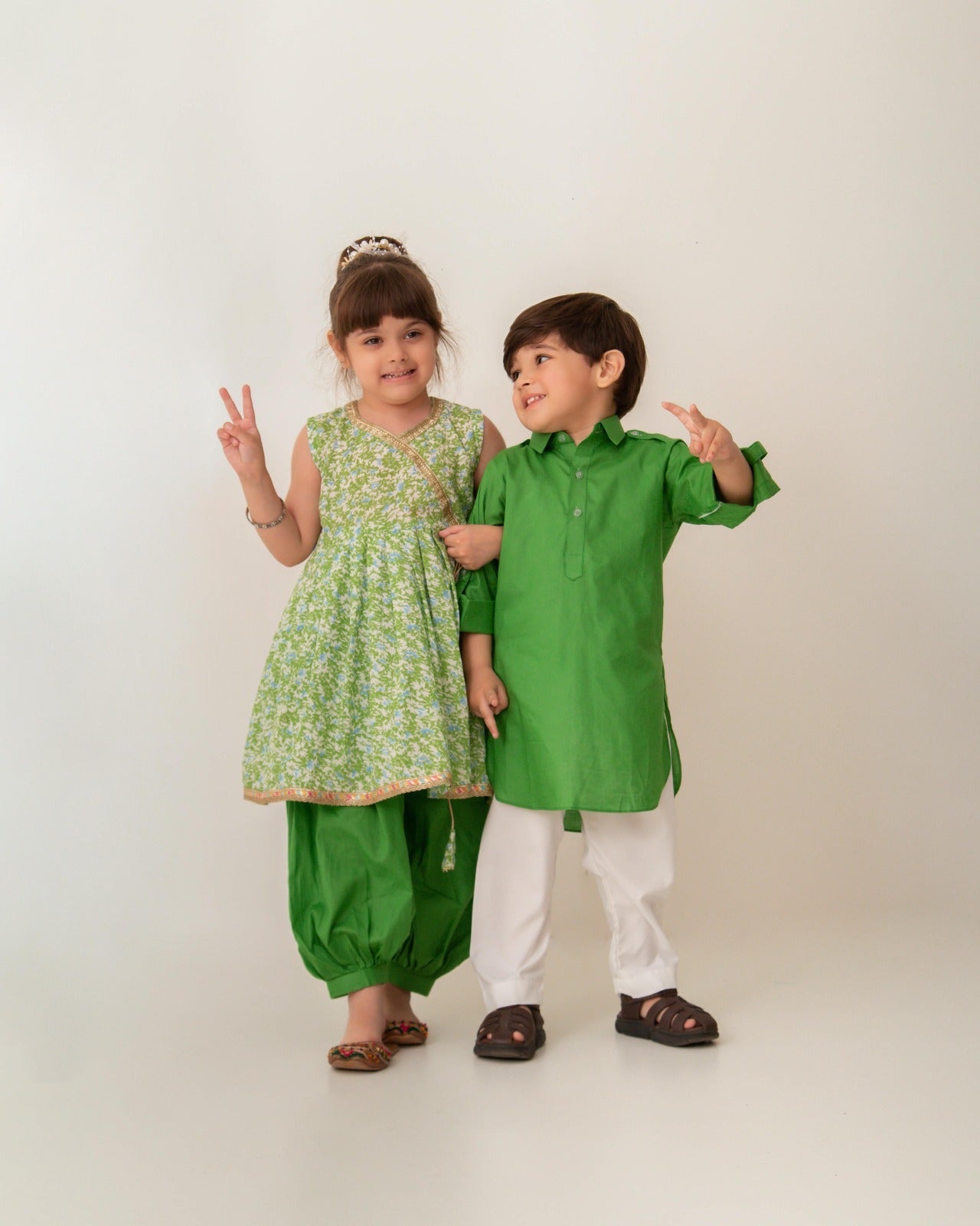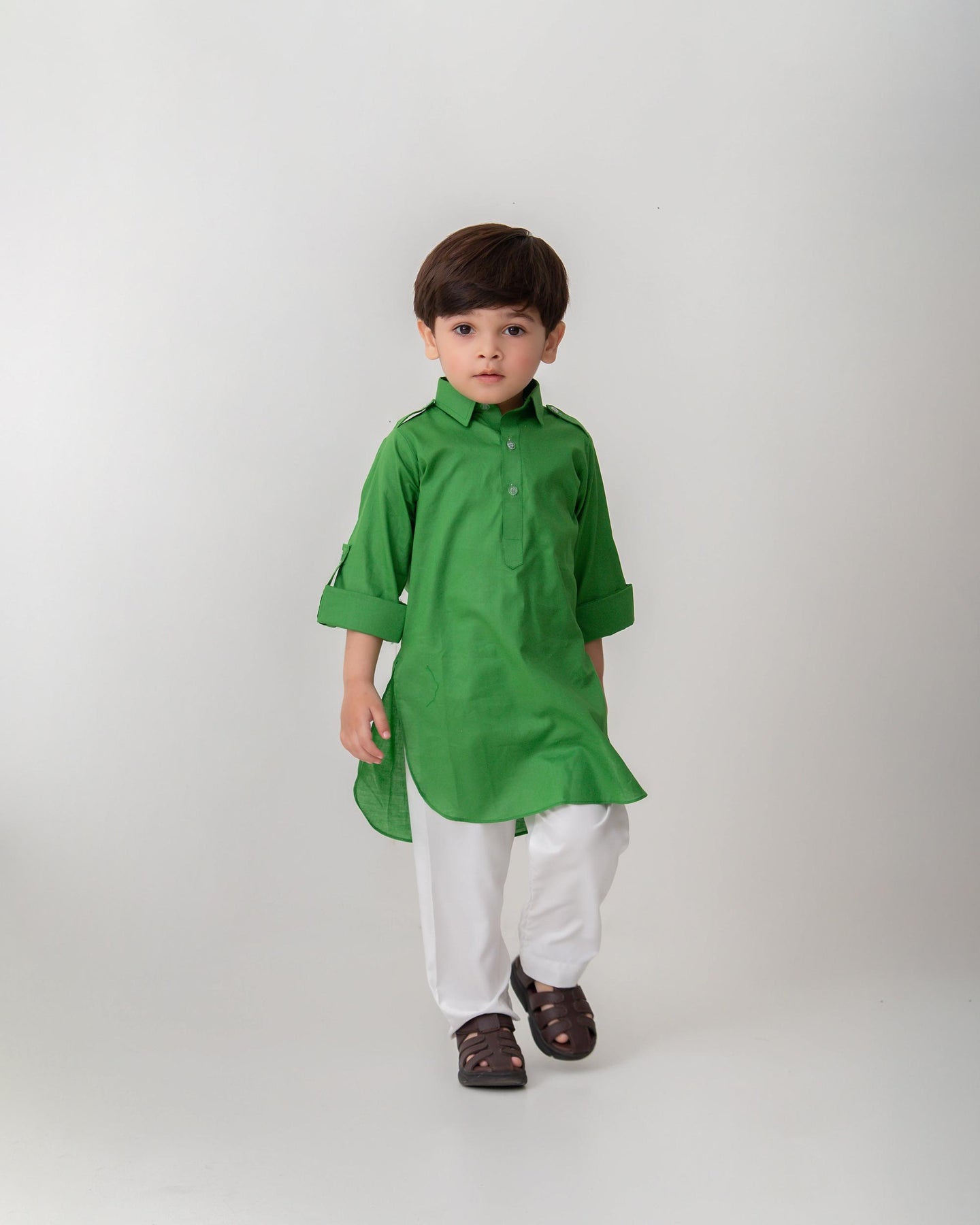 Dress your little gentleman in this versatile cotton kurta, designed with button-up sleeves and a sharp collar for a crisp look. The matching wash-and-wear pajama ensures he stays comfortable and ready for playtime or family gatherings. A perfect mix of style and practicality!