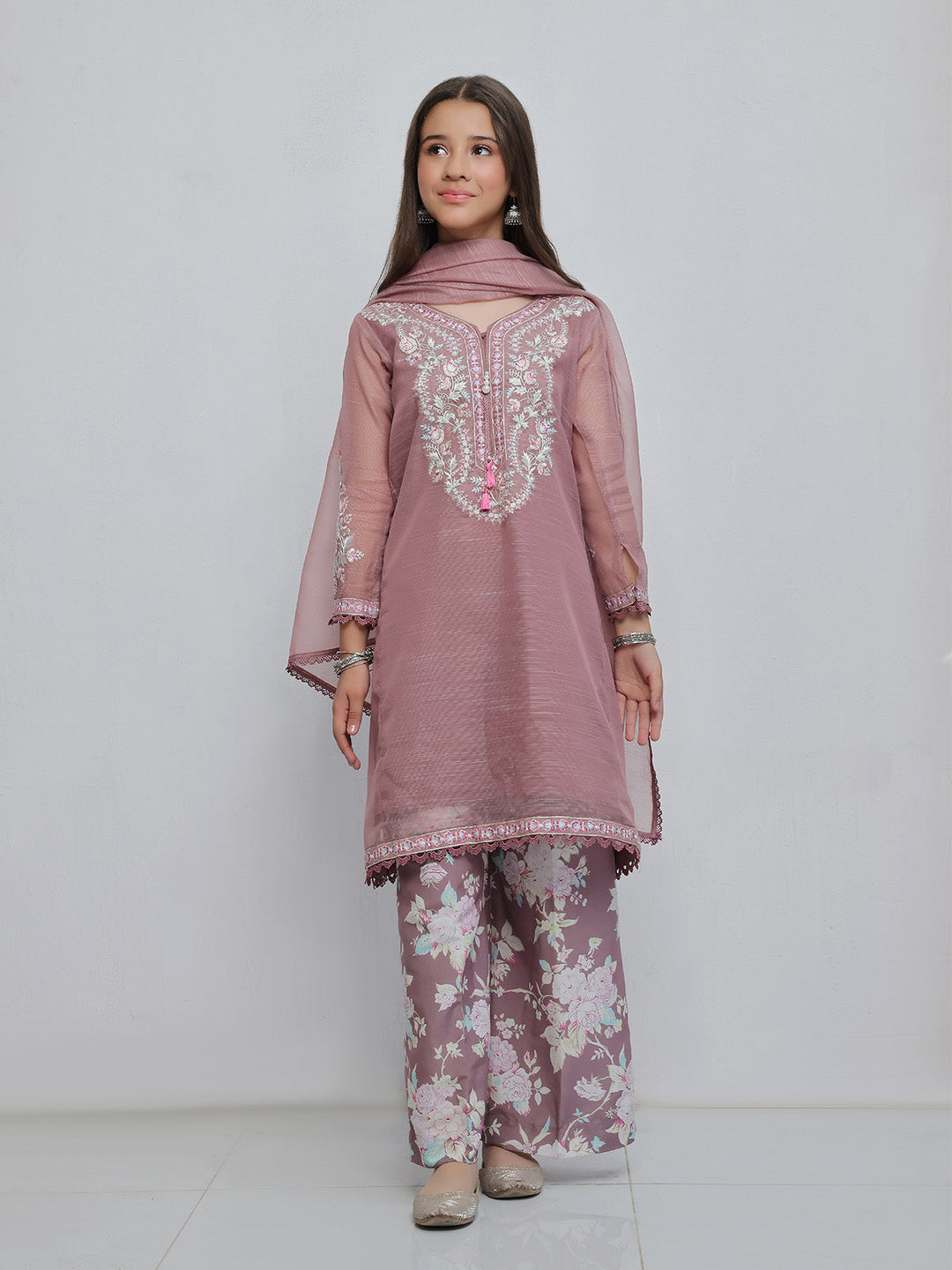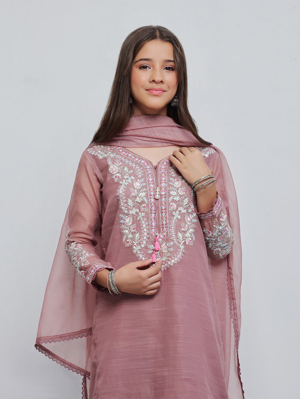Oaks - Embroidered Slub net polly Suit For Girl - Bronze - 3 Piece