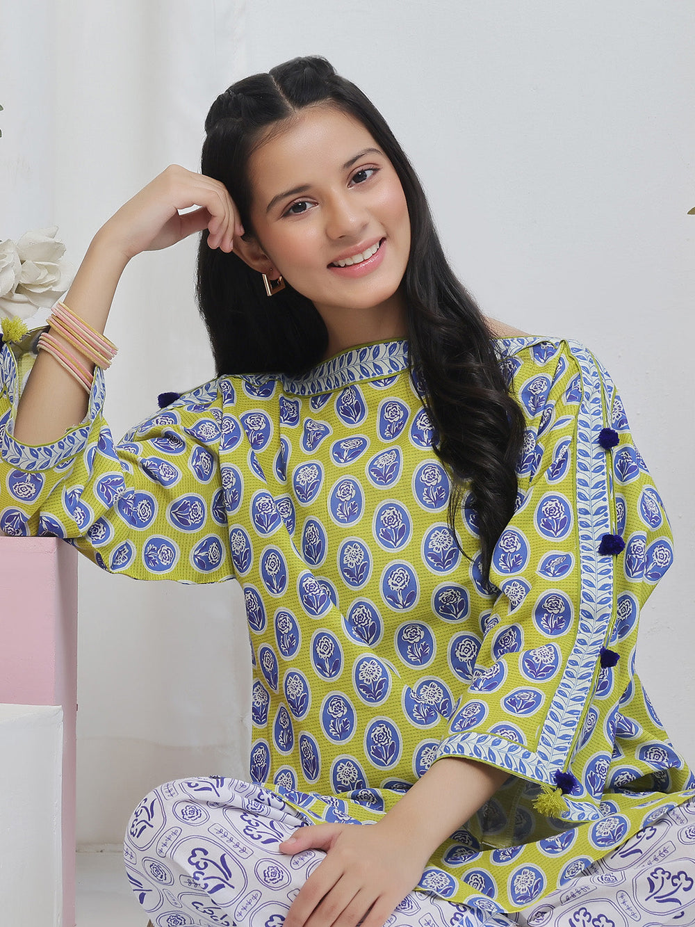 Oaks - Printed Lawn Suit For Girl - Green&Blue - 2 Piece
