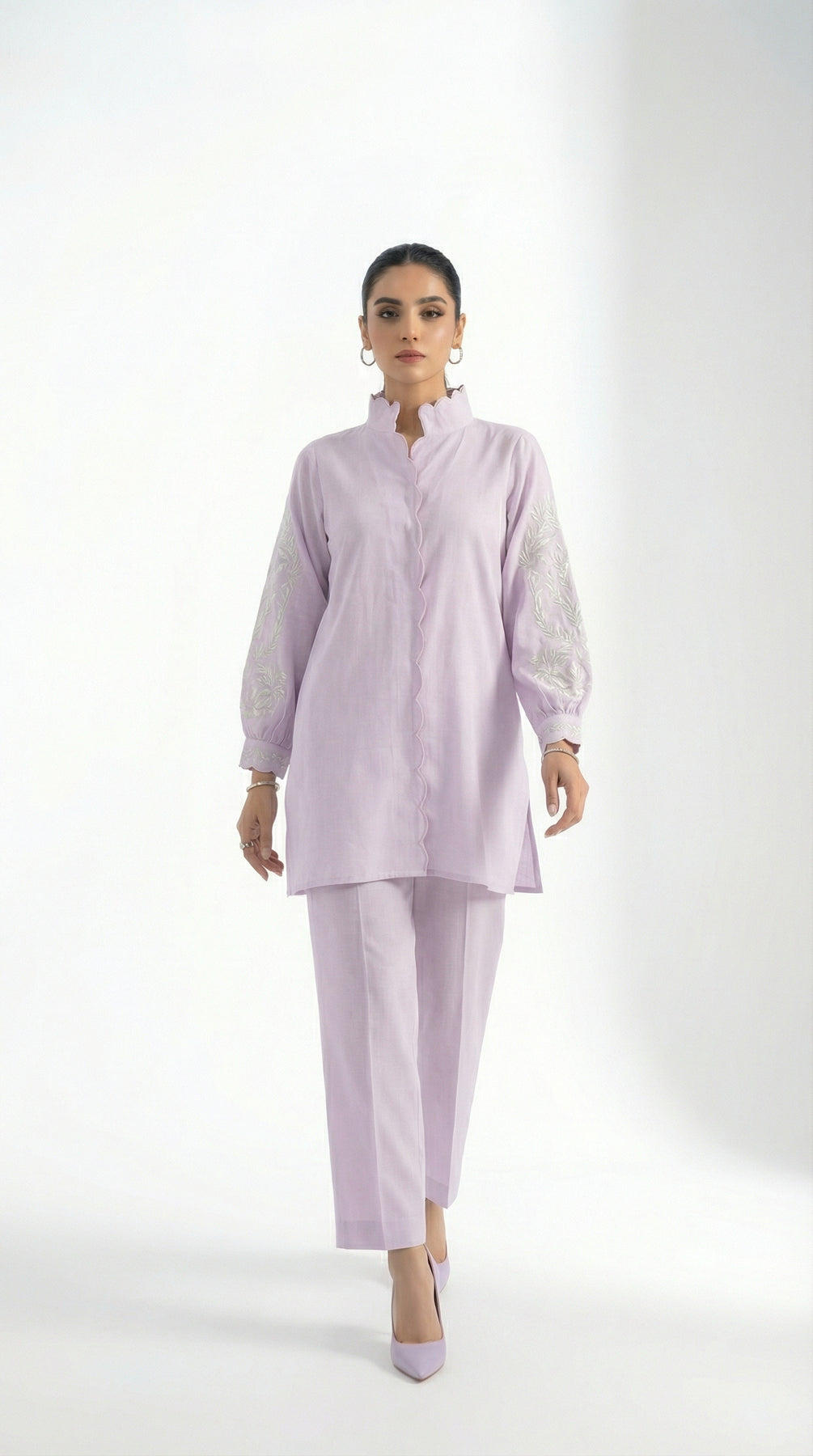 Shirt: Irish Lawn Pant: Irish Lawn Dupatta: Chiffon - Lima: A graceful lilac ensemble crafted in premium Irish lawn, designed to embody soft elegance and refined sophistication. ? The shirt features delicate scalloped detailing along the neckline and front, with beautifully embroidered sleeves that add a feminine touch. Paired with a flowing chiffon dupatta finished with lace, this timeless outfit creates a light, elegant look perfect for summer occasions. ??