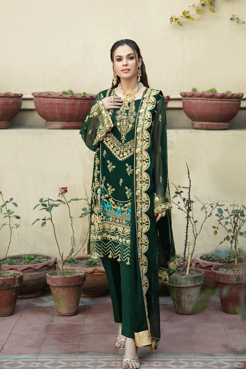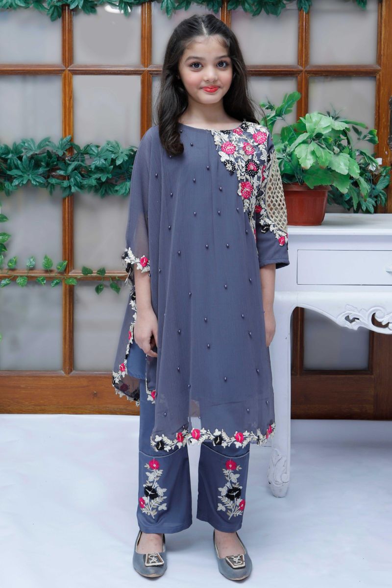 Modest - Embroidered Chiffon Suit For Girl - Teal Blue - 3 Piece