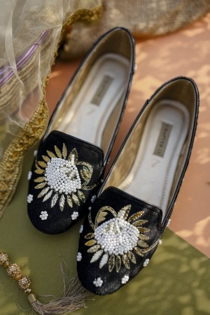 Slip into luxurious style with these black micro velvet loafers. Hand embroidered in mukaish and pearls, they add a touch of uniqueness to any formal outfit. The dull golden insole and foam cushioning provide comfort and sophistication. Get ready to step up your shoe game! Upper: Micro Velvet Bottom: Anti Skid Sheet Sole Please note: Due to the handmade nature of the collection and professional photography lights; colors, and/or patterns may vary slightly from the image shown. Minor differences enhance the beauty and uniqueness of each style