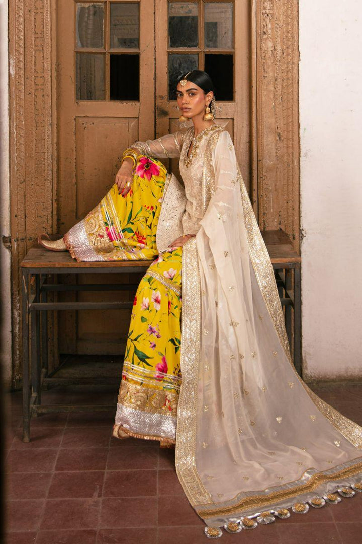 "Azara" presents our traditional off-white shirt and gharara ensemble. The chikankari kameez boasts intricate silk thread embroidery, adorned with embellishments such as panni tilla and gota ashrafis. The sleeves are adorned with elaborate panni tilla embroidery. Complementing the ensemble is a digitally printed charmeuse silk gharara, featuring thick borders of gota and lappa. Paired with a matching off-white chiffon dupatta, adorned with panni tilla borders on all four sides and motifs scattered across the fabric. This illuminated ensemble is a classic silhouette meticulously draped to create an enchanting look.