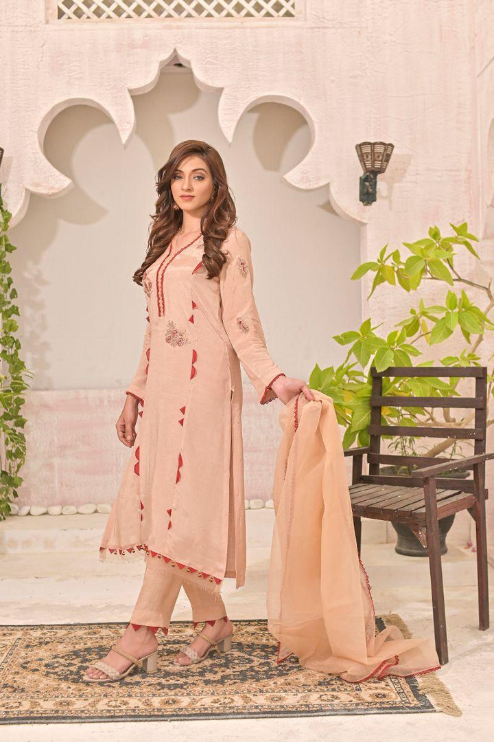 The Long silhouette shirt on raw silk featuring Embroidery & overlapping neckline. The neckline is adorned with organza thread details adorned with pearls styled.The shirt can be paired with matching organza dupatta & state pant . Prices are for 3pcs Stitched Shirt Fabric:- Raw Silk Pant Fabric:- Raw Silk Dupatta:- Organza