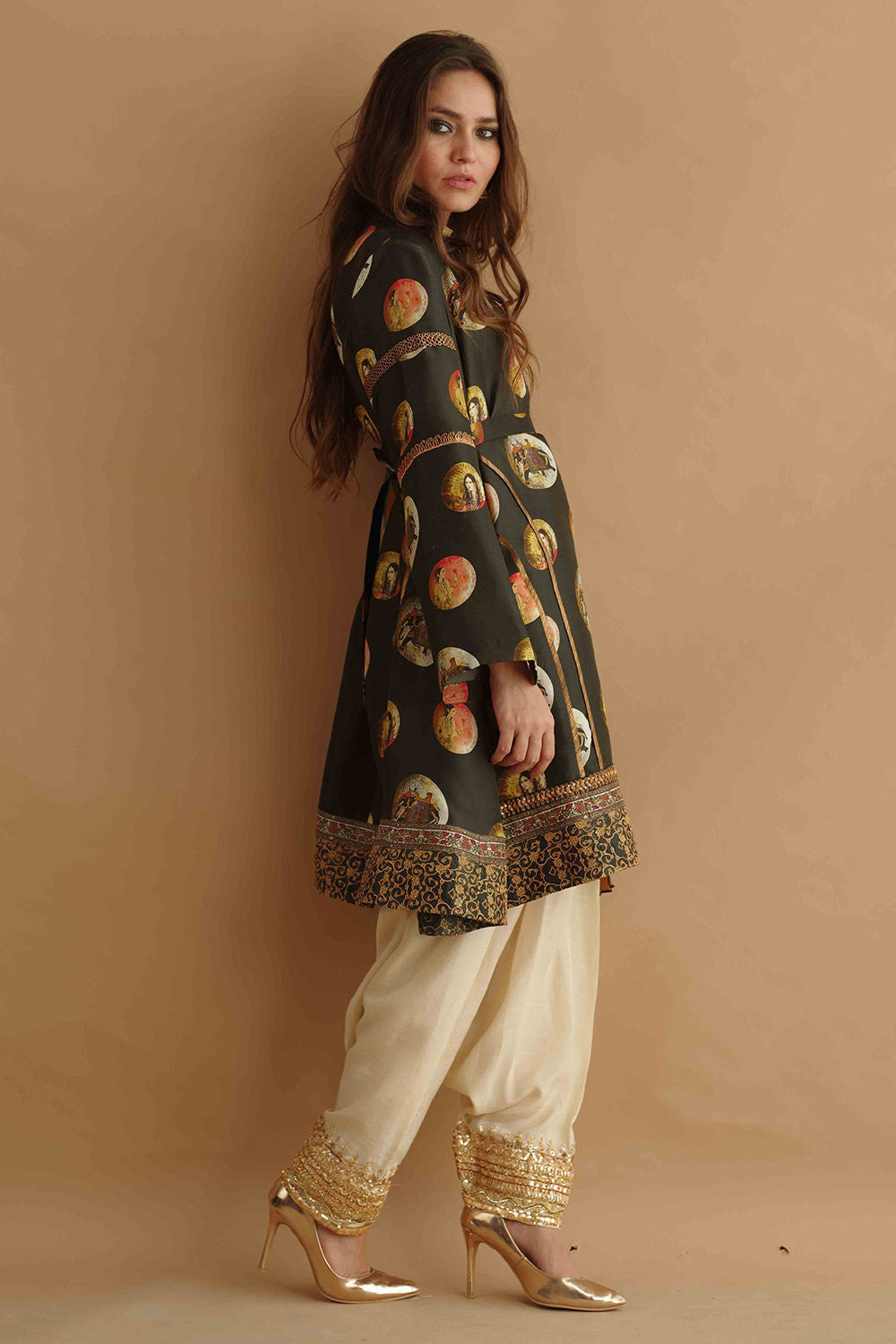 Digitally printed silk inspired by mughal motifs modern angrakha cut, egded with hand worked pattis in antique sequins and beads, resham and sequins worked square motifs in zardozi on front and sleeves. Gold tilla worked in paisley pattern on sleeves and outlines on borders.