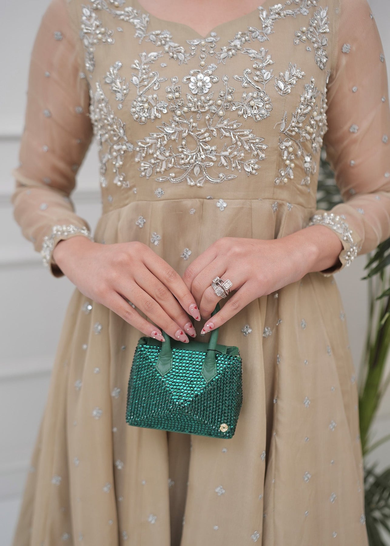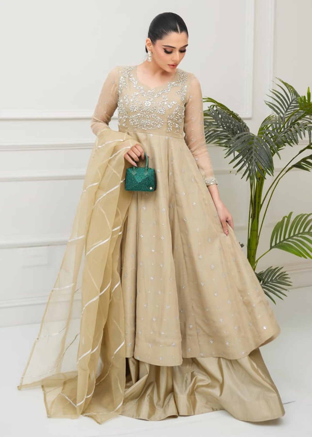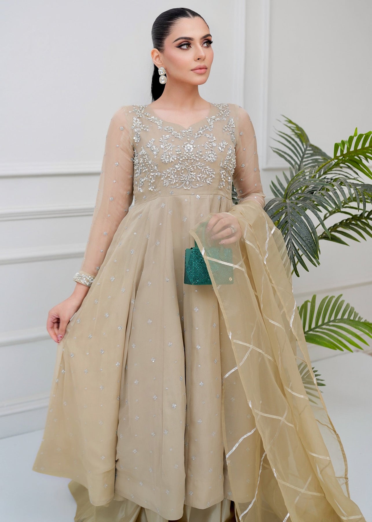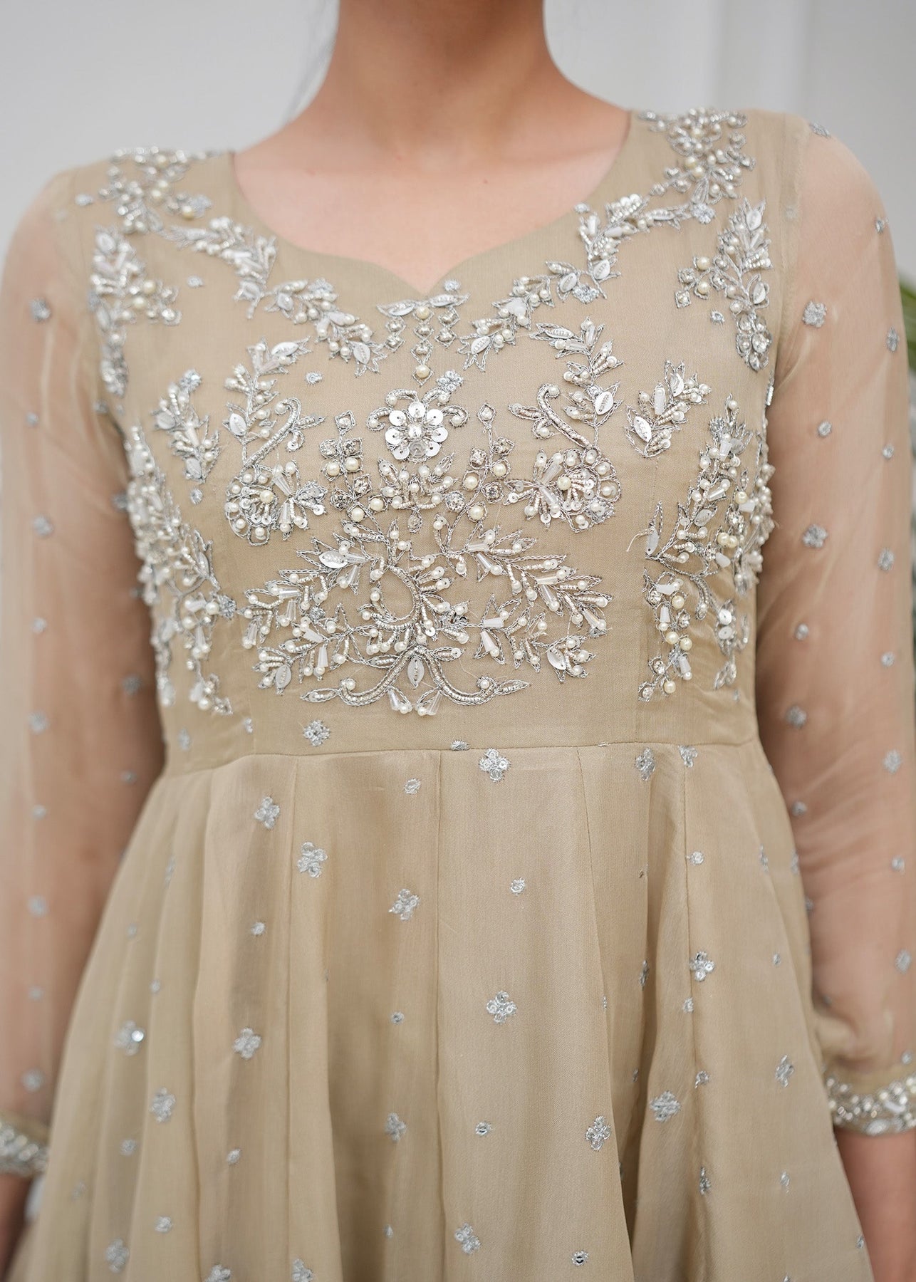 This sophisticated three-piece ensemble is presented in a warm champagne beige hue, offering a timeless and understated elegance perfect for elevated festive wear. Designed to exude grace and refinement, the outfit features a fluid, flared silhouette that enhances movement while maintaining a structured, flattering form. The bodice is adorned with intricate, finely detailed embroidery that adds a subtle shimmer against the neutral base, creating a luxurious yet balanced aesthetic. The embellishment is thoughtfully placed to highlight the upper silhouette, flowing seamlessly into the airy fall of the fabric. The look is completed with a sheer, lightweight dupatta, finished with delicate linear accents along the borders. Its fluid drape adds movement and dimension, perfectly complementing the understated elegance of the ensemble.