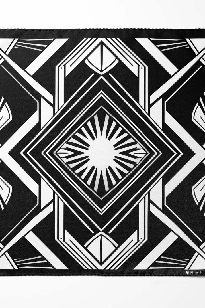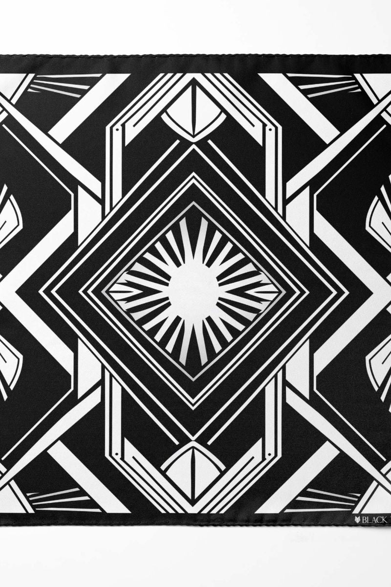 Sophisticated black pocket square featuring a symmetrical geometric pattern with a central diamond and sunburst motif, radiating an aura of refined elegance and versatility.