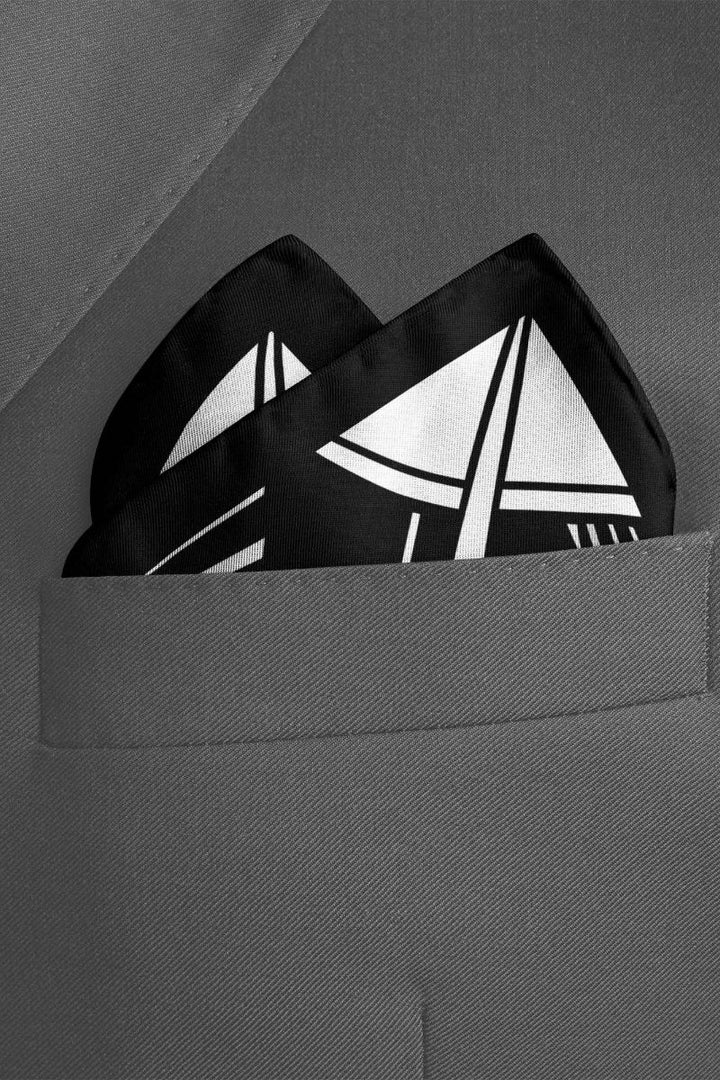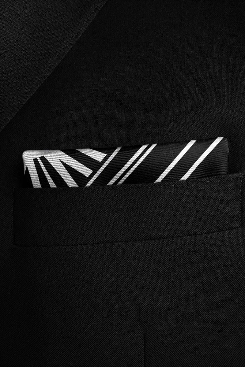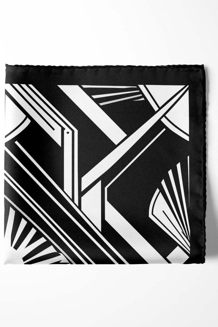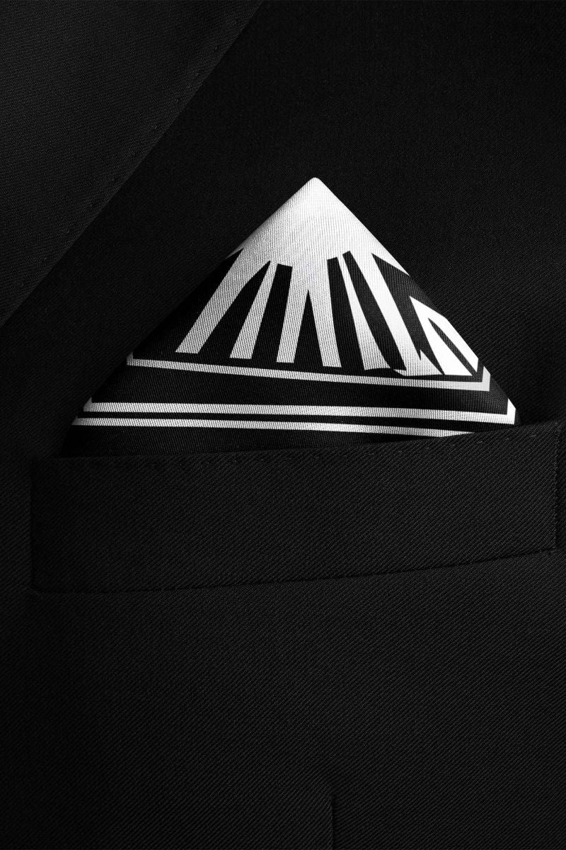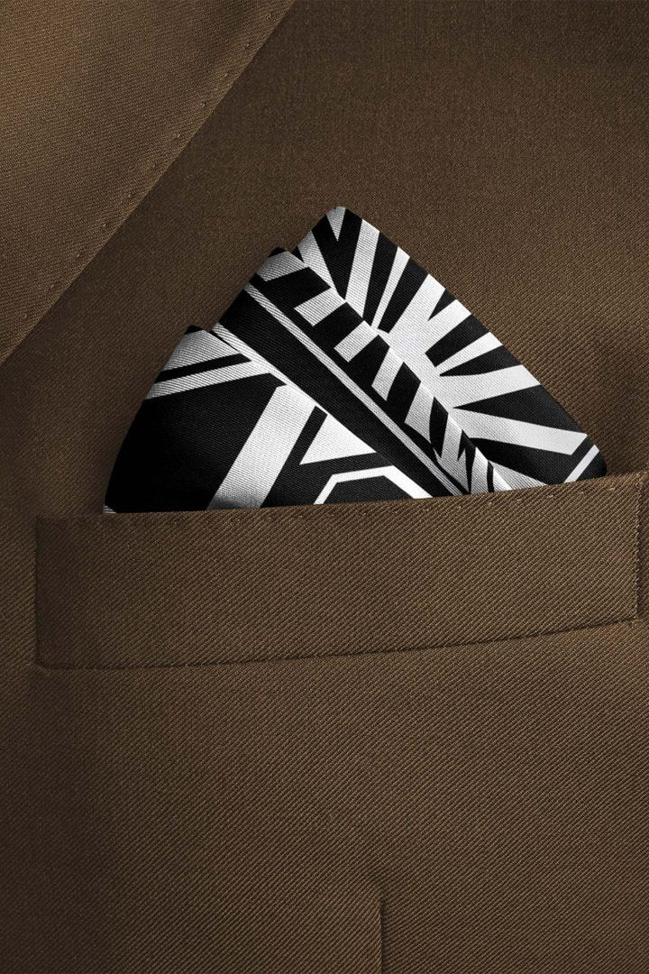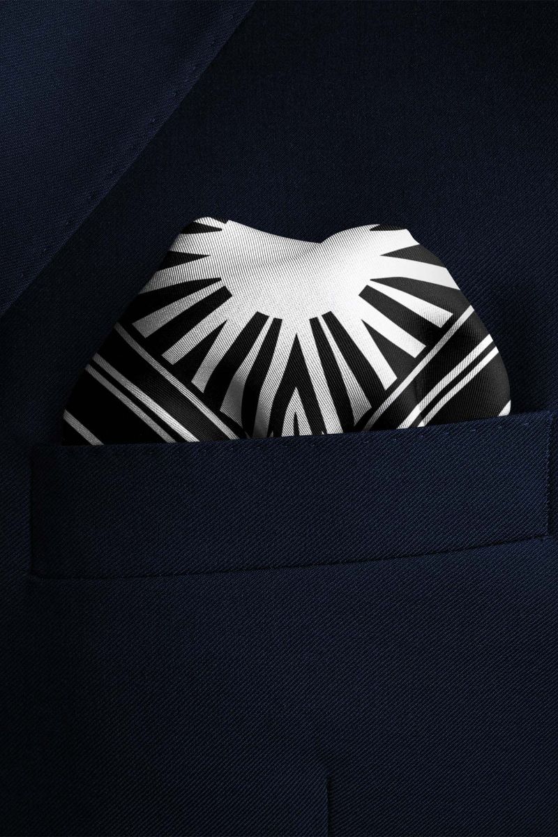 Sophisticated black pocket square featuring a symmetrical geometric pattern with a central diamond and sunburst motif, radiating...