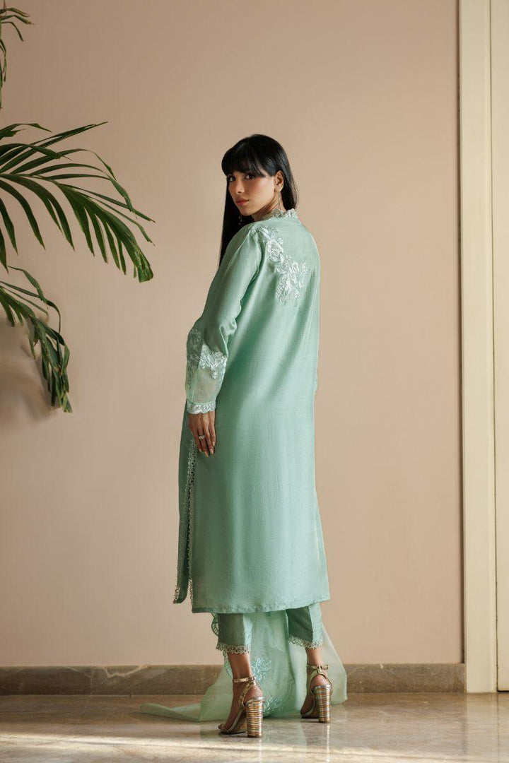 A raw silk tunic with delicate lace motifs and scalloped lace paired with straight pants finished with lace. The outfit is paired with an organza embroidered dupatta