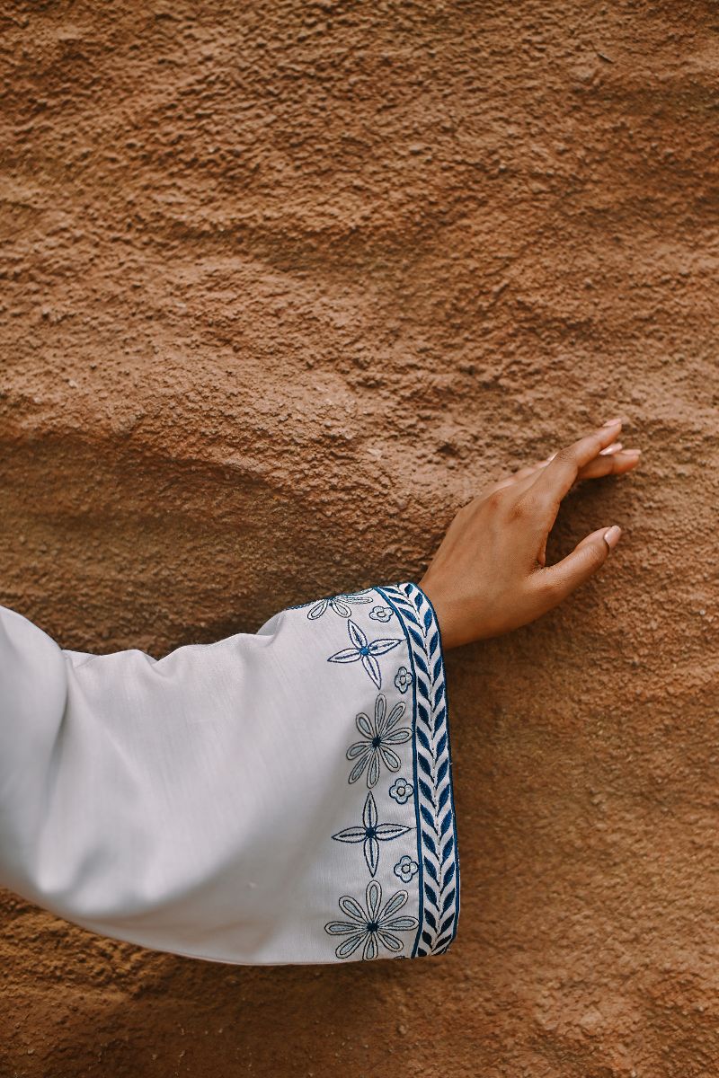 Palm Whisper captures the relaxed charm of the coast. The long, kaftan style white shirt drapes with ease, detailed with cool blue embroidery along the lower front and sleeves like waves meeting the shore. Paired with simple straight pants, it’s a look that’s airy, graceful, and perfect for warm, sunny days. Whether you’re by the beach or just wishing you were, Palmae brings that calm, breezy Amalfi feeling to your wardrobe.