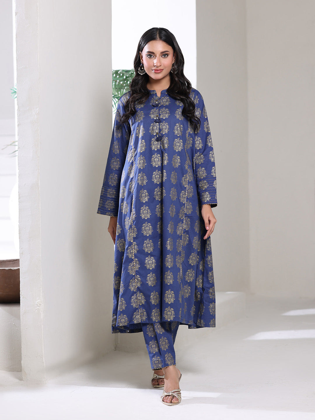 Oaks - Screen Print Cambric Suit For Women - blue Gold - 2 Piece