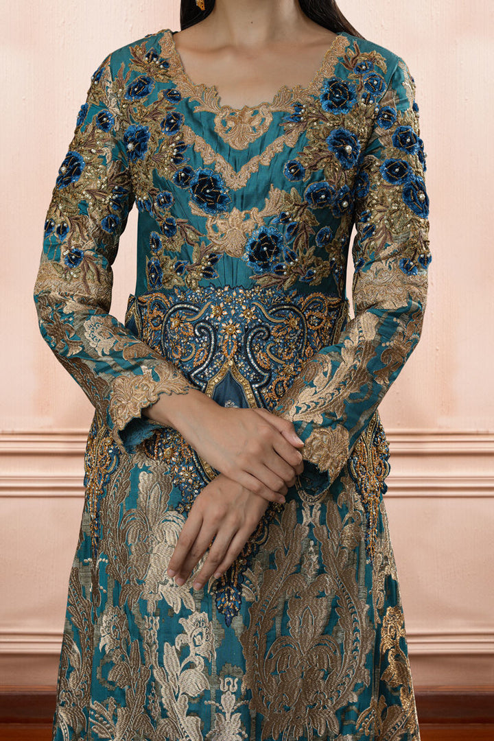 Experience the epitome of elegance with a modern twist on the classic kaftan. This luxurious turquoise blue piece, crafted from exquisite silk fabric, redefines sophistication
